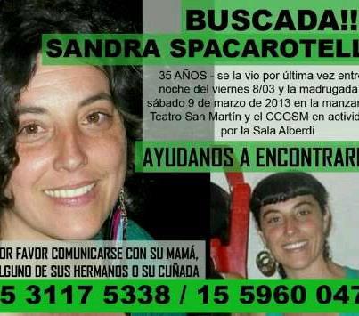 Familiares y amigos de Sandra Spacarotella, de 35 años, la buscan incansablemente desde el viernes 8 de marzo pasado. Sandra es de Temperley y vive con su madre, Elsa Moyano, y la pareja de la madre. Participan a tiempo completo en la campaña de búsqueda también sus hermanos Pablo y Javier Spacarotella y una cuñada.