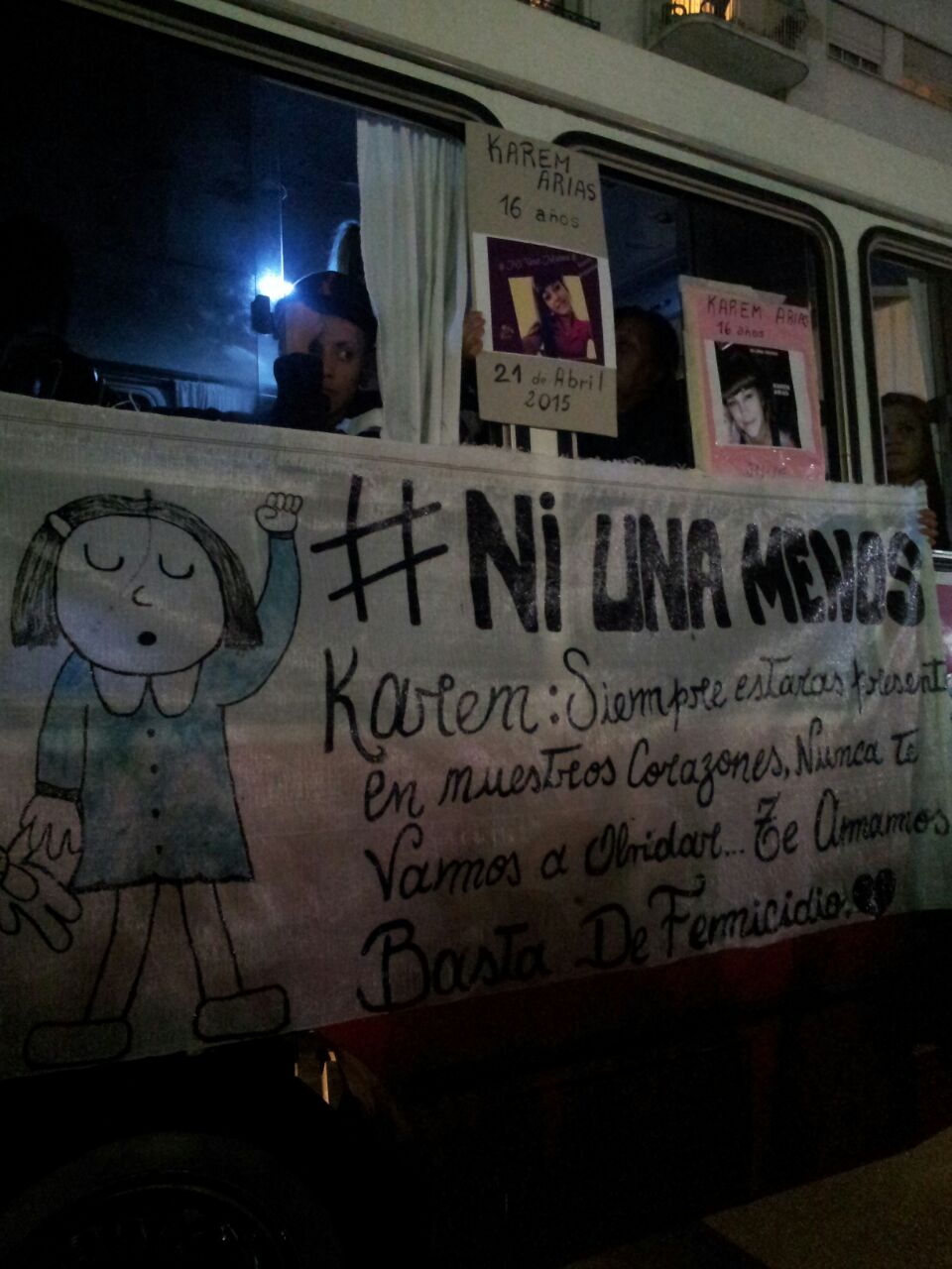 | El micro en el que llegaron familiares y vecinos de Karem. |