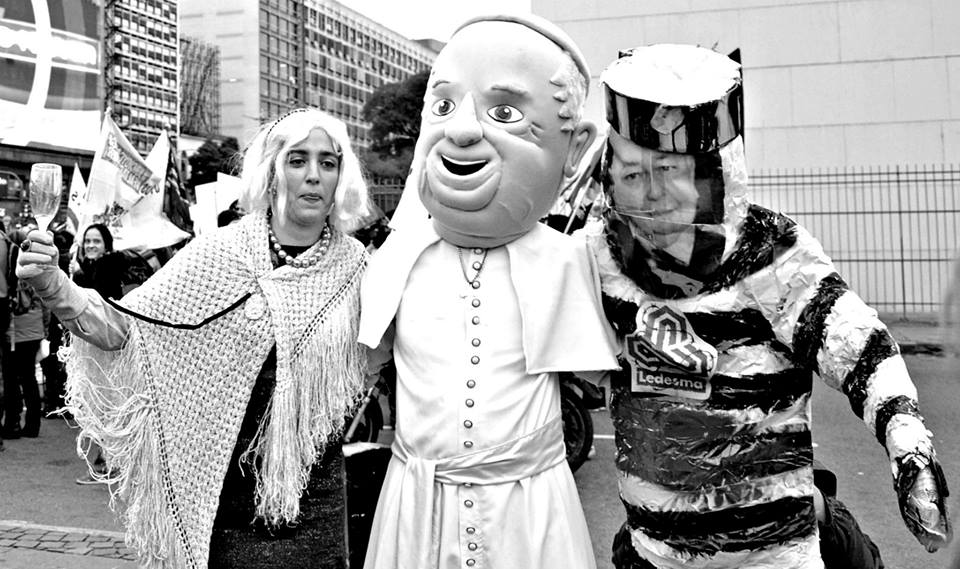 En el obelisco se produjo un cruce inesperado. Rodeado de turistas que no paraban de sacarse fotos con él, un falso Papa Francisco, con su careta sonriente a más no poder, veía pasar la marcha sin entender demasiado quiénes serían ni por qué. Allí Arrieta, que seguía subida al camión, bajó con esfuerzo por uno de los laterales (rápida de reflejos Revale) para llevar al muñeco de Blaquier y conseguir una foto juntos. Antes, Arrieta tomó la mano del muñeco Francisco y se arrodilló ante él con veneración.