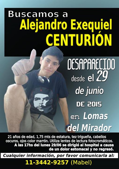 (Por RNMA) Alejandro Ezequiel Centurión, vecino de Lomas del Mirador, La Matanza, tiene 21 años y el 29 de junio pasado se dirigía hacia algún hospital del Conurbano cercano a la General Paz en la zona oeste. Le avisó a su familia que iba a buscar un certificado médico para poder llevar a la fábrica donde trabajaba porque venía sintiéndose mal hacía algunos días. Es un chico 1,75 metros, tez trigueña, cabello oscuro, ojos marrones, usa unos lentes fotocromáticos y es delgado. Hasta el día de hoy, a casi dos meses de ese momento, la familia no tuvo noticias de su paradero y emprendió una búsqueda que está a cargo de la fiscal Sogio de la UFI Nº6 de San Justo. También son acompañados por la APDH de La Matanza. Para aportar información: 15 3442 9257. En comunicación con Enredando Las Mañanas, el programa de la Red Nacional de Medios Alternativos, Mirta Torales, mamá del joven desaparecido, mostró su tristeza y desesperación.