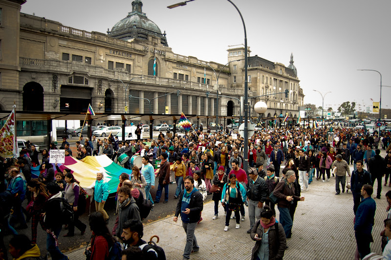 (Por RNMA) Con esa consigna marchó el viernes 31 una caravana con 60 integrantes de los pueblos Qom, Pilagá, Wichí y Nivaclé, junto a organizaciones sociales, políticas y de derechos humanos, desde la Torre de los ingleses frente a la estación Retiro hasta el Acampe Qo.Pi.Wi.Ni (que lleva más de cinco meses de existencia en el cruce de 9 de Julio y Avenida de Mayo), con paradas previas en el Obelisco porteño y Plaza de Mayo. La caravana había partido el día anterior en micros desde Formosa hacia Buenos Aires para reforzar la lucha por sus derechos ancestrales sobre las tierras que les están siendo arrebatadas, denunciar los ataques diarios a sus integrantes, la persecución que sufren de parte del gobernador kirchnerista formoseño Gildo Insfrán (Gobernador de la provincia desde 1995) y repudiar la inacción del gobierno nacional. Desde las 15 horas, la Red Nacional de Medios Alternativos (RNMA) realizó una transmisión en vivo de la jornada, donde se escucharon diversos testimonios.