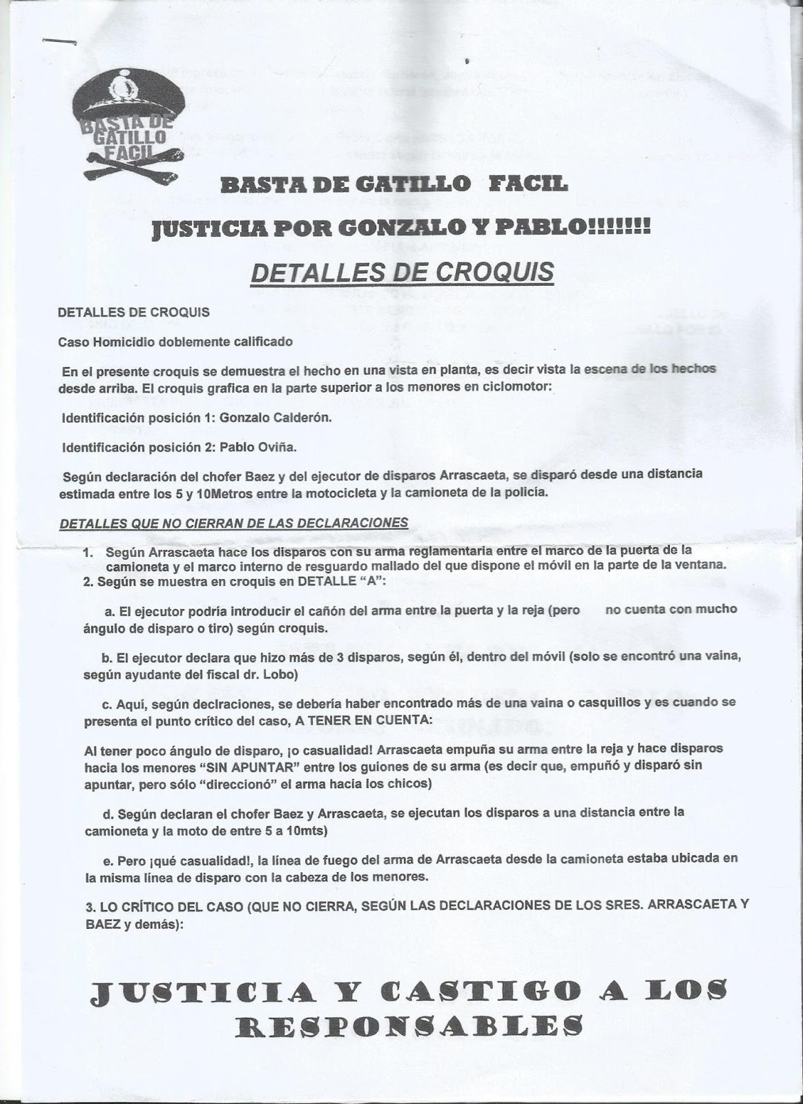 En la madrugada del 3 de noviembre de ese año, Pablo y Calderón, de 16 años, iban en una moto cuando comenzaron a ser perseguidos por la policía. “Supuestamente ellos llegaron hasta el camping y desde ahí los empezaron a perseguir, los siguieron por toda la ruta y continuaron hasta que los ejecutaron. Fuimos a la pericia y el policía dijo que fue un solo disparo que pegó entre los dos, pero no es así. Pablo murió en el acto y mi hijo estuvo durante una semana en terapia intensiva, después falleció”, contó Álvarez. (Ver croquis debajo).