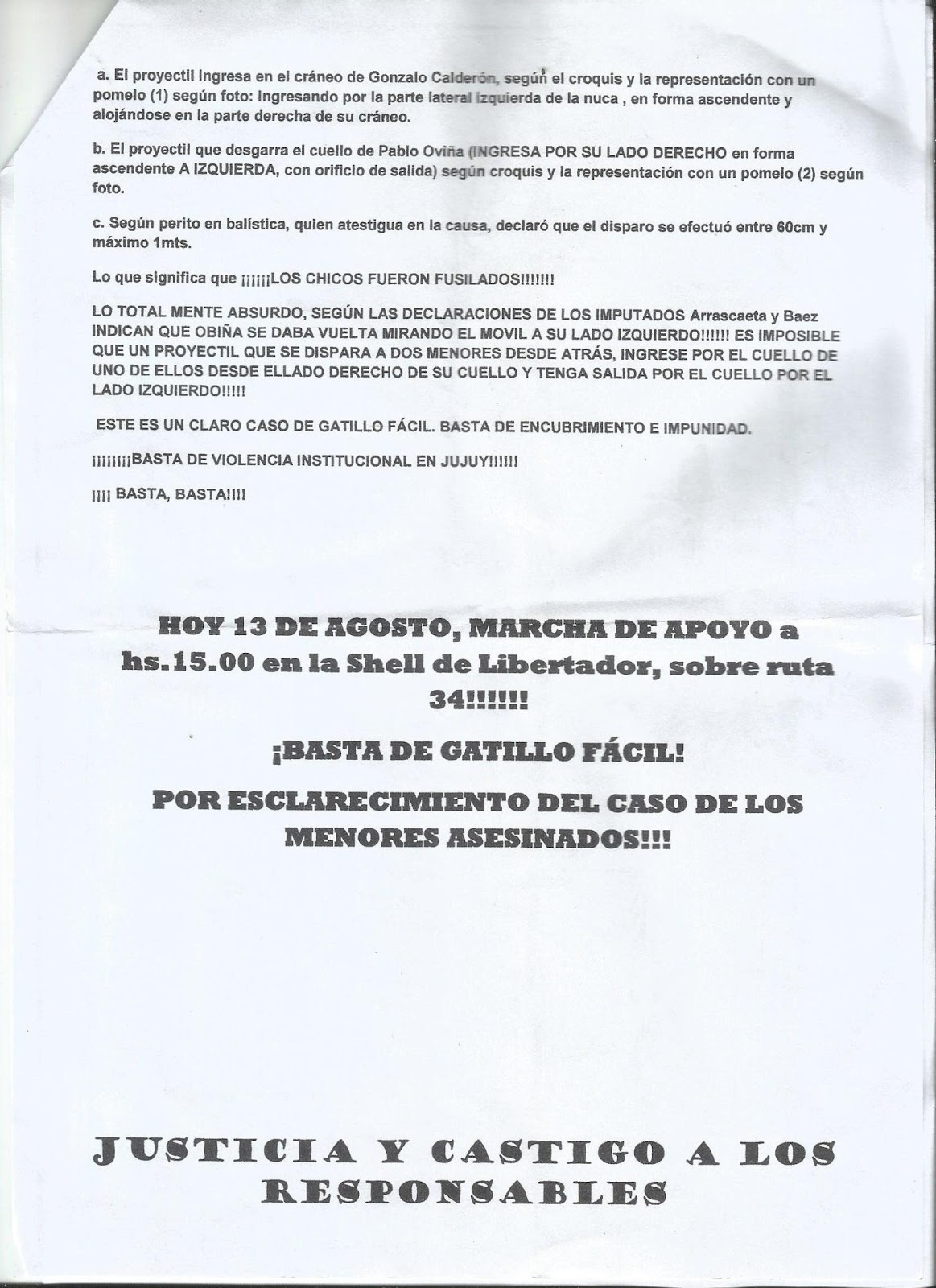 “Mi hijo estaba yendo a la escuela, Gonzalo también, 4º año, Pablo en 2º –continuó Arébalo–, salían como cualquier joven a bailar, en motocicleta. Se juntaban con los amigos en la plaza o en el boliche de Ledesma. Salieron con Gonzalo y no volvieron esa noche, realmente no sabemos la verdad, nosotros sinceramente queremos la verdad, que se sepa lo que les hicieron, y que se haga justicia, pedimos justicia por los dos. Es una injusticia, y los mataron como a perros. El asesino directamente fue a cazarlos. Pablo había cumplido recién 16 años y fue que le regalaron la moto, no tenía la costumbre de salir en moto, les armaron una causa también de robo esa noche, y mi hijo no tenía antecedentes de robo, ningún antecedente. Y ahora les armaron esa causa de robo de un celular, que todavía no se ha comprobado. Y ahora salimos a pedir justicia por los dos. Queremos que se sepa la verdad, qué hicieron con los chicos, quizás fueron torturados, golpeados y ahora un poco está saliendo a la luz y parece que fueron dos proyectiles, no solo uno como decían ellos. Queremos justicia con los dos porque ya no aguantamos con este dolor. No aguantamos porque es un dolor inmenso que sigue ahí y no va a terminar más. Así que nos juntamos las dos y vamos a buscar ayuda, lo que sea para poder lograr que se haga justicia, porque hay un encubrimiento muy grande allá, las familias nos sentimos solas, no podemos lograr que se sepa la verdad”.