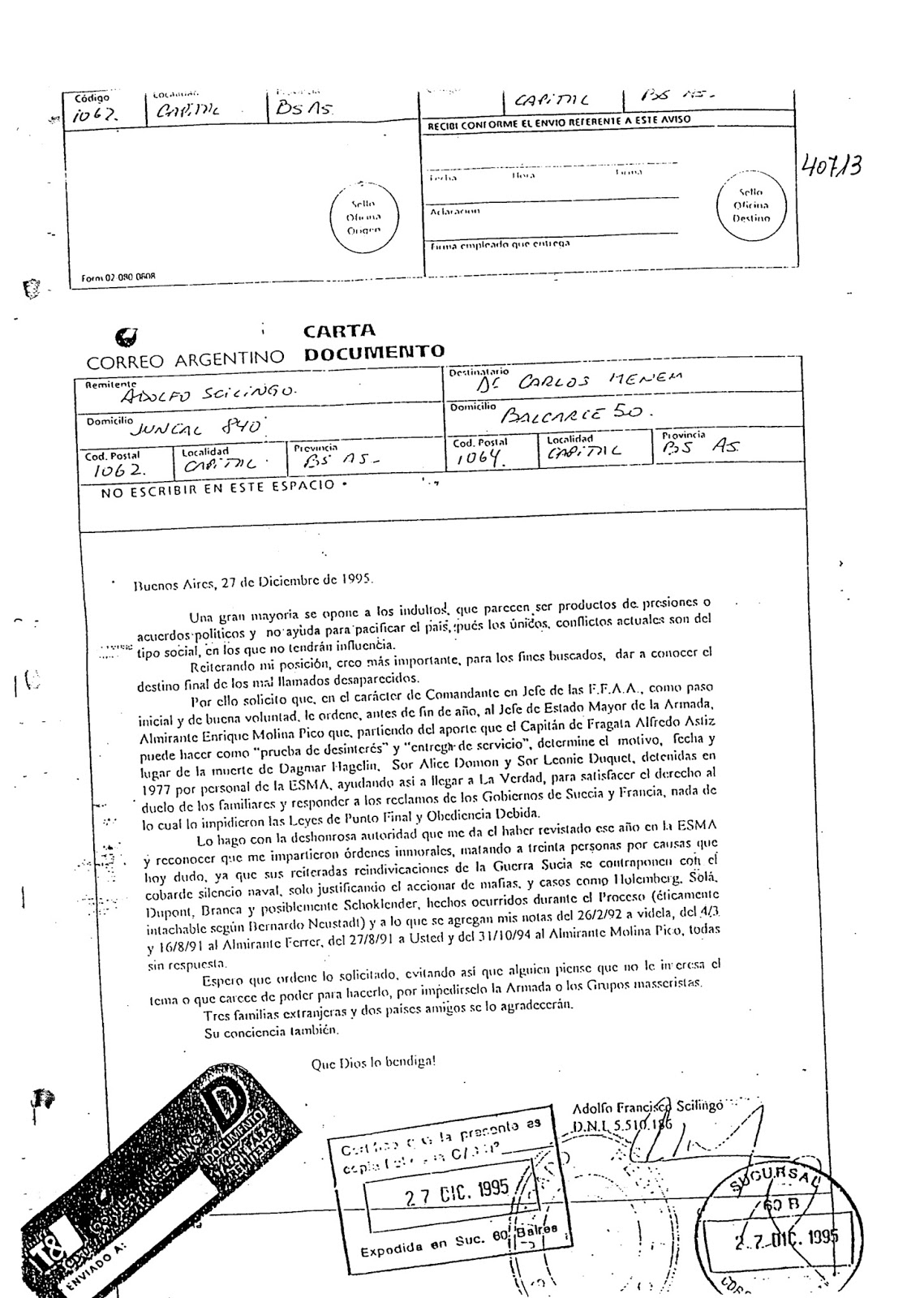 Aquí mostramos algunas de las cartas que el represor Adolfo Scilingo envió al juez español Baltasar Garzón, al entonces presidente Carlos Menem y al Jefe de Estado Mayor de la Armada, entre otras, admitiendo su participación en la comisión de delitos de lesa humanidad dentro de la ESMA.