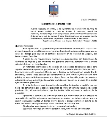Lo concreto es que el martes 3 de noviembre, los asambleístas recibieron la noticia de que, a través de la intermediación del Obispo de La Rioja Marcelo Colombo, se había logrado el retiro de la minera: “ahora estamos esperando directamente que se concrete la retirada, que levante sus monos, sus trapos y se retire junto con la gran militarización que tenemos en la zona de Angulos”, agregó.