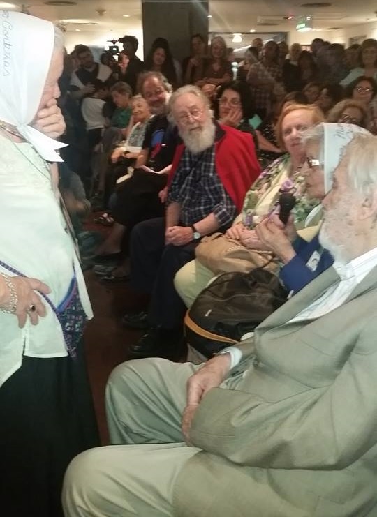 La consigna que eligió Nora para su acto de re-conocimiento, como lo llamó ella, fue que cada persona que tomara la palabra contara cómo y dónde se habían conocido. La integrante de Madres de Plaza de Mayo-Línea Fundadora eligió que Osvaldo Bayer sea el primero en hablar: “nos conocimos en Alemania, es increíble… en plena dictadura las Madres salieron al exterior a denunciar lo que estaba ocurriendo con sus hijos y llegaron a Alemania, y había ofrecido mi pobre departamento en el barrio reo de Kreutzberg, por si ellas querían entrar. Por supuesto rechazaron todos los demás y entraron a mi pobre departamento. Allí nos conocimos y allí pudimos tener largas charlas; allí me pintaron realmente lo que era la dictadura militar, lo que era el sistema de desaparición de personas. ¡Qué fuerza estas mujeres!, impresionante hacer ese viaje y contar sobre sus hijos, me emocionaron tanto que desde ahí yo tomé el camino de ellas y las apoyé en todo lo que pude. El recuerdo de Nora Cortiñas va a quedar para siempre, una heroína del pueblo, una mujer increíble”.