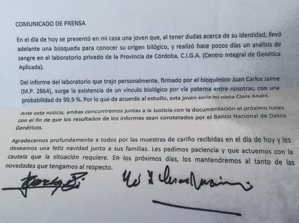 Todo comenzó cerca del mediodía de ayer, cuando la joven, que viviría en Córdoba, se acercó a la casa de Chicha en La Plata con los resultados de un análisis realizado en un laboratorio privado, que llevaba la firma de Juan Carlos Jaime (M.P. 2864), que daba el enlace filial entre ambas en un 99.9%. La Fundación Clara Anahí, que preside Elsa Pavón, la primera abuela en recuperar a su nieta, emitió un comunicado en el que se contaba la noticia y se convocaba a una conferencia de prensa para el día lunes. Eso sucedió a las 13:29 a través de la cuenta de Facebook de Chicha que lleva su nombre, María Isabel Chorobik. Para dar cuenta de ella, esperamos hasta poder comunicarnos directamente con alguna persona de la Fundación. Lo conseguimos un rato después, cuando conseguimos dialogar con una de las colaboradoras de la Fundación, quien nos expresó que si bien no hablarían hasta la conferencia de prensa del lunes, la noticia estaba confirmada y podía darse a conocer.