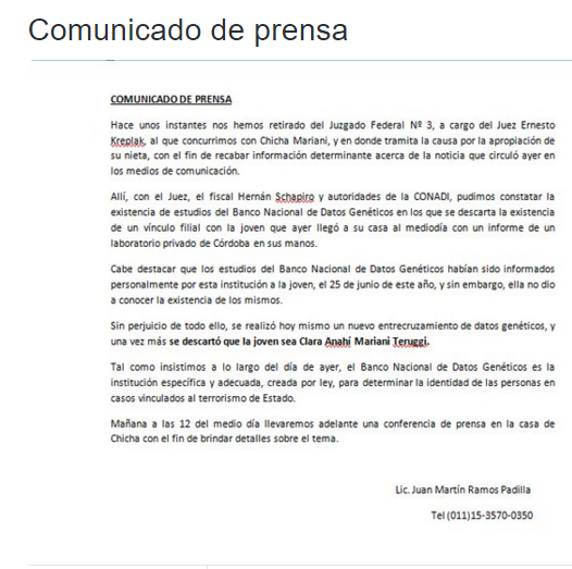 Foto: El último comunicado que desmiente el parentesco entre la joven y Chicha Mariani.