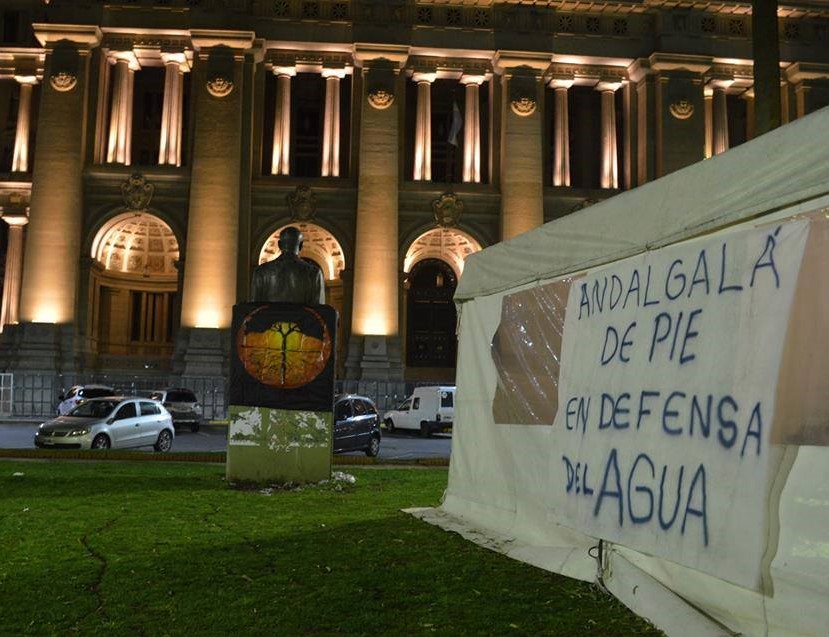 En 2010 se presentó un amparo donde pedíamos por el ambiente de los habitantes del pueblo para vivir en un lugar sano. Fue en relación al emprendimiento de Agua Rica que aún pretende explotar el Cerro Aconquija, que es nuestro tanque de agua y está a 14 kilómetros en línea directa del pueblo. Este emprendimiento sería tres veces más grande que el de Alumbrera. Ahí empezó una lucha tremenda contra esa multinacional, y ahora estamos en la instancia de la Corte Suprema. Lo que se pide es la nulidad del acto administrativo, que violó la ley general del ambiente. Estamos esperando que se resuelva a favor del pueblo, y por esa razón estuvimos en diciembre toda una semana, como forma de hacer presión, entregando panfletos en la puerta de la Corte, con banderas, remeras y volantes, y también asesorando a la gente porque los que pasan se prenden, les interesa y preguntan qué es esto, preguntan dónde es Andalgalá y te dicen que la minería no, que es muy fea. La cuestión es que estos días estamos con mucha fe de que la resolución va a salir a favor del pueblo, venimos hace mucho tiempo luchando contra esta empresa y la verdad que es muy agotador”, expresó Silvina Reguera, integrante de la Asamblea El Algarrobo de Andalgalá.