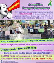 Tal como lo vienen haciendo desde hace años, este domingo 14 de febrero, a las 11, la Asamblea de Parque Chacabuco volverá a reunirse, pero esta vez será especial: “en una de las esquinas del parque, en Asamblea y Emilio Mitre, vamos a hacer la asamblea como siempre pero con un festejo con los detalles de cómo fue este logro de la baja de la licitación. Están invitados todos los vecinos para que nos acompañen y sigamos adelante para ver cómo hacer que ese dinero que se iba a destinar al bar y va a seguir estando se destine a cosas más útiles, por ejemplo a parquizar el parque, a poner mejor las instalaciones que están bastante deterioradas”, explicó Margarita Compañez, orgullosa de la organización entre los vecinos que logró que se suspenda la instalación de un bar con concesión privada en medio de un espacio verde público. No obstante, deslizó que seguirán atentos para que el paso adelante sea victoria definitiva.