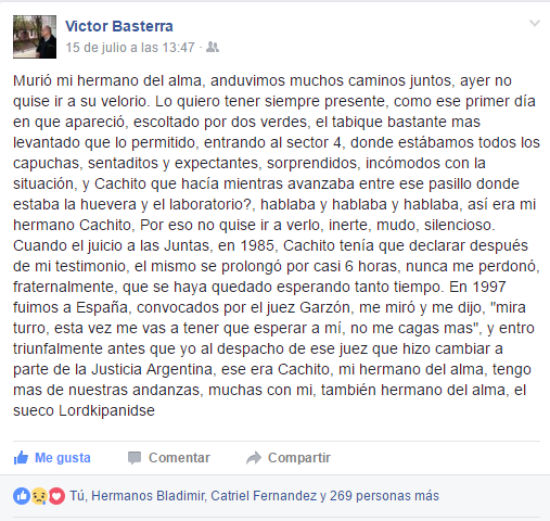 Basterra no fue al velorio de Cachito: «Lo pensé, mi hija quería que fuéramos pero le dije que vaya ella. Tengo otra forma de homenajearlo al compañero que está con nosotros. La pérdida de Cachito me pegó muy fuerte. Lo despedí a través de un pequeño escrito contando algunas anécdotas que para mi parecer pintaban lo que era Cachito poniendo algunas cosas en cuestión (ver foto). No quise ir porque prefería tenerlo presente como lo que él siempre fue hasta el último momento: un compañero muy vivaz, muy lleno de inquietudes». Basterra no tardó en retroceder al período compartido en cautiverio: «En el Pozo, en la ESMA, era un diálogo constante con el primero que se le ponga a tiro. Así lo recordé. Pude recordar otras anécdotas con él, también…, anduve mucho con Cachito. Fuimos a distintos lugares, estuvimos persiguiendo a algunos ñatos, tanto en Necochea como en Ushuaia. Siempre en esa búsqueda de pegarle duro a la impunidad».