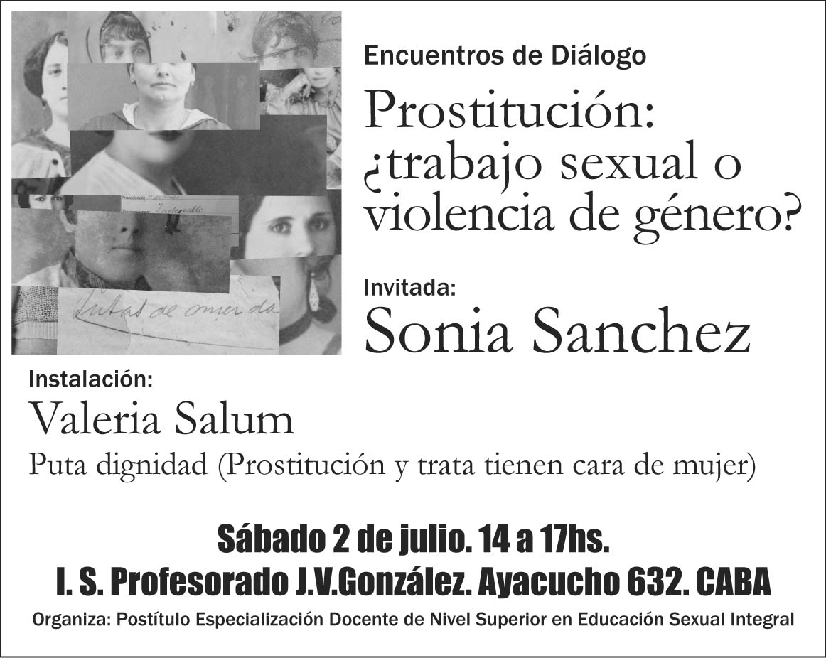 Prostitución ¿trabajo sexual o violencia de género? La Especialización en Educación Sexual Integral que funciona en el Instituto Superior del Profesorado Joaquín V. González generó un encuentro de diálogo para intentar responder esa pregunta que recorre el movimiento de mujeres, las organizaciones LGTTBI, y todos los espacios de trabajo acerca del género. La invitada al «diálogo», que en realidad dejó mudas a las más de 200 personas que participaron escuchándola, era Sonia Sánchez, histórica luchadora contra la explotación sexual. La artista Valeria Salum montó su muestra Puta dignidad (prostitución y trata tienen cara de mujer), que es resultado de una investigación que visibiliza la vida de las mujeres en las casas de tolerancia de Buenos Aires a principios del siglo pasado, y expresa una contundente denuncia contra las políticas reglamentaristas. (Por La Retaguardia)