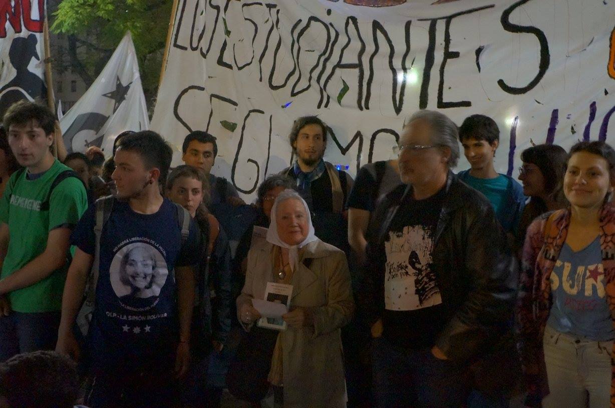 A su turno, Nora Cortiñas aseveró: “traigo el abrazo de Madres Línea Fundadora, pero traigo especialmente el de los 30.000 compañeros detenidos desaparecidos, que están con nosotros en cada lucha, que recogemos sus banderas de lucha todos los días y hoy apoyamos todo el reclamo de los estudiantes, hombres y mujeres, chicos y chicas que están en esta lucha justa, que tienen que salir adelante y vencer, por eso yo quiero que todos juntos digamos lo que decimos las Madres todos los jueves, ya van a ser 40 años, los 30.000 detenidos desaparecidos presentes, ahora y siempre, hasta la victoria siempre, venceremos”.