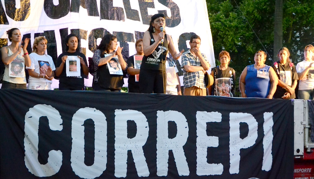 Durante el acto, tuvo una intervención Mariana Gerardi, referente de la Campaña Nacional contra la Violencia hacia las Mujeres, quien destacó que se haya puesto este bloque específico: “tiene que ver con el rol de las mujeres organizadas y en lucha, y para nosotros es fundamental, es un aporte muy importante. Nosotras sufrimos la violencia machista y patriarcal en nuestros trabajos, en nuestras casas y sobre todo en nuestros barrios. Pensaba en la cantidad de compañeras mujeres que hoy estamos acá, mamás, hermanas, abuelas, que más allá del dolor han podido encontrar en Correpi, en la necesidad de la organización y la lucha, el poder todas juntas encontrarnos, luchar y dar batalla contra el patriarcado y la justicia machista. Y en este sentido traer a la compañera Reina Maraz, una compañera pobre, boliviana, que está presa hace mucho tiempo, estamos esperando ahora que el tribunal de Casación de la Plata le dicte su libertad. Venimos también del caso de Alika (Kinán) que dio testimonio de cómo el Estado es responsable y proxeneta de la prostitución y desaparición de cientos de chicas y de niñas. Si pensamos el gatillo fácil en los varones, lamentablemente en nuestras barriadas, todo lo que tiene que ver con las redes de trata está avalado y sobre todo dejan el terreno liberado para que esto suceda, y esto lo hacen desde el Estado y las fuerzas represivas. El disciplinamiento viene de muchos lugares, sobre nosotras, sobre nuestros cuerpos. Hoy son más de 275 mujeres muertas por femicidios en 2015”.