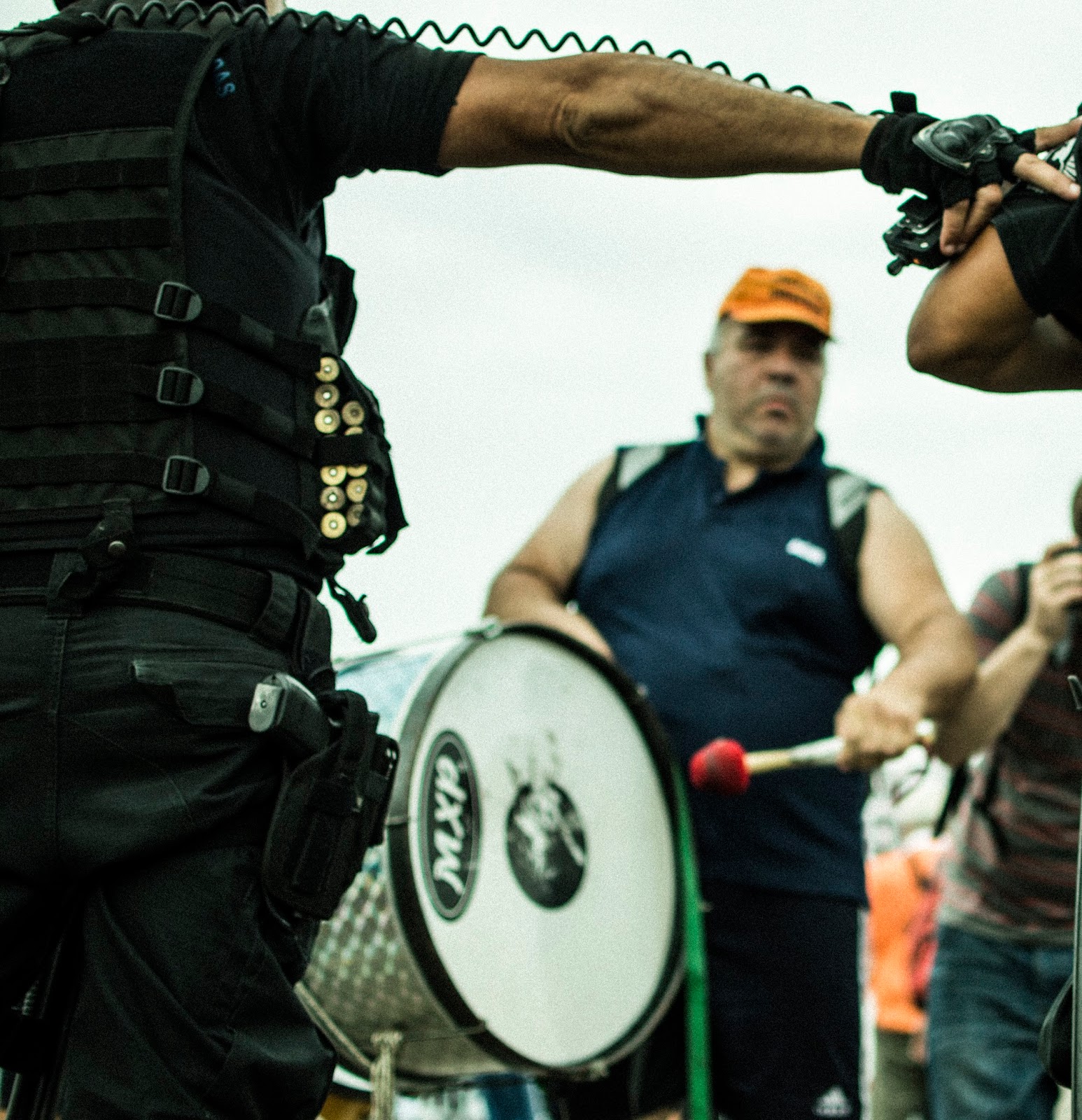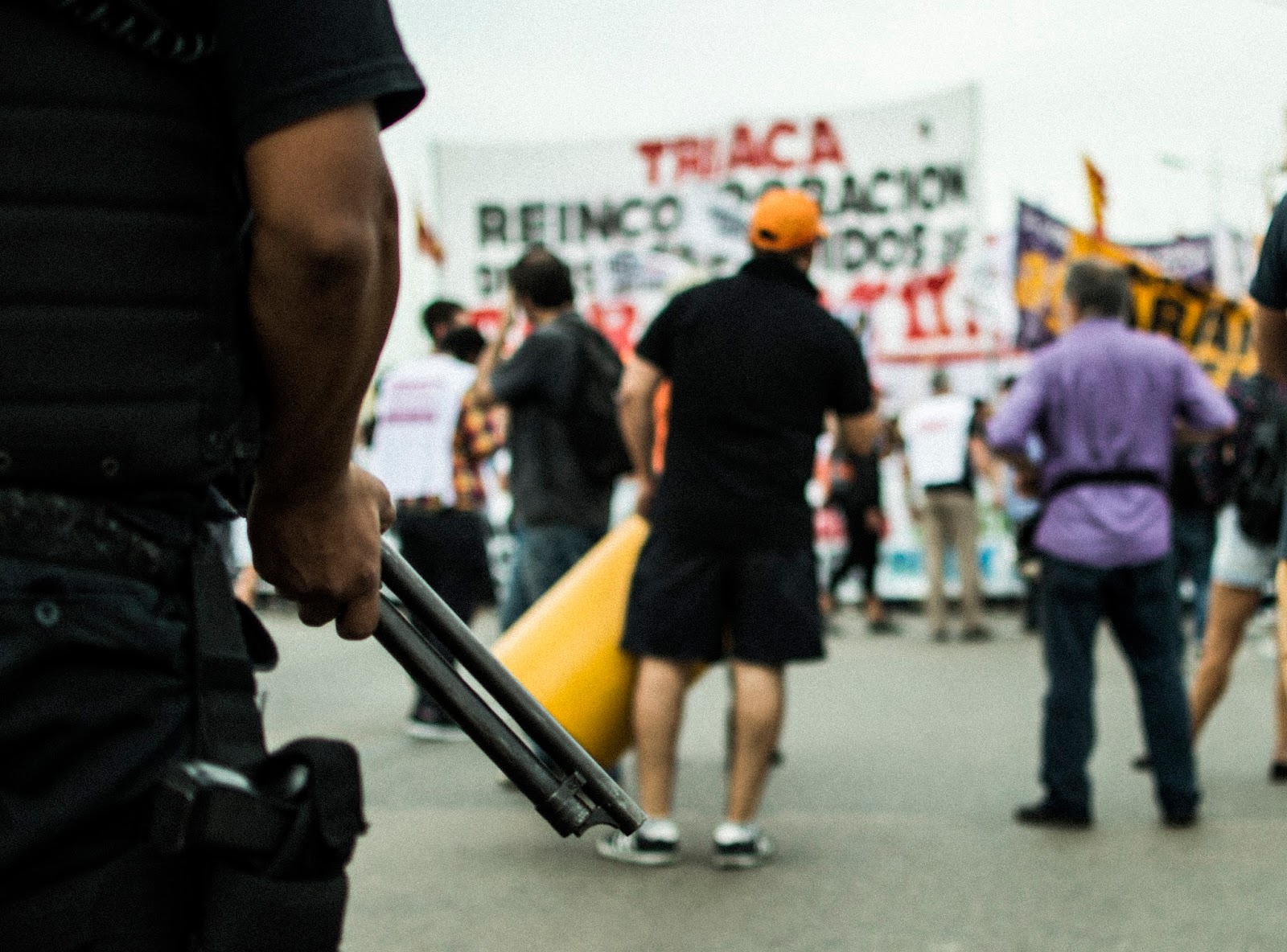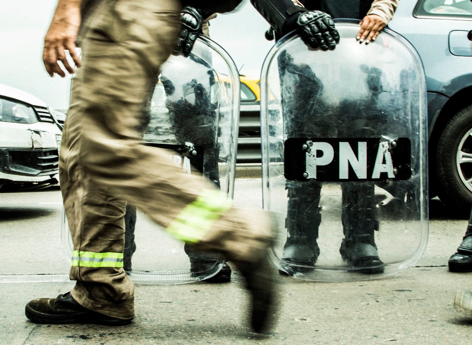 Los trabajadores de AGR-Clarín y numerosas organizaciones sociales, políticas, estudiantiles y sindicales, entre otras, suben al Puente Pueyrredón. El despliegue de las fuerzas represivas también es numeroso. Exhiben sus armas, sus carros, sus motos, todo el equipo. La parafernalia en seguridad bien aplicada. Lo mismo pasa en los otros cortes. Panamericana y 202, y Acceso Oeste y Vergara.