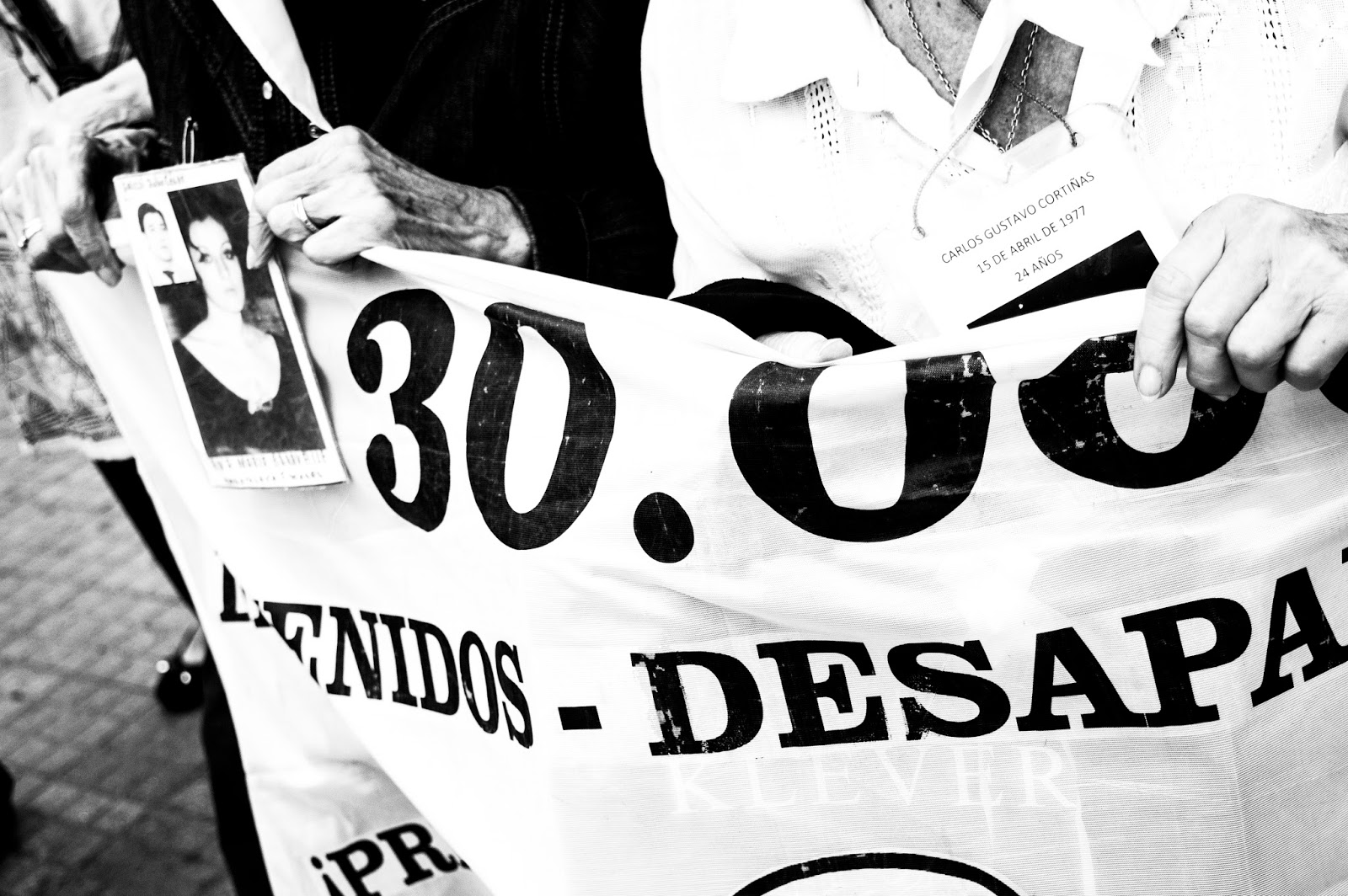 Ahí va ella, sosteniendo la bandera que dice 30.000 detenidos desaparecidos. El 30.000 con letras grandes, destacadas, color negro, que contrastan con el fondo blanco, para que quede bien visible, por si hay quienes no lo entendieran… Su mano derecha sólo suelta la bandera para levantar un puño cada vez que se oye un “¡Presente!” después de escuchar todos y cada uno de los nombres de nuestros desaparecidos.