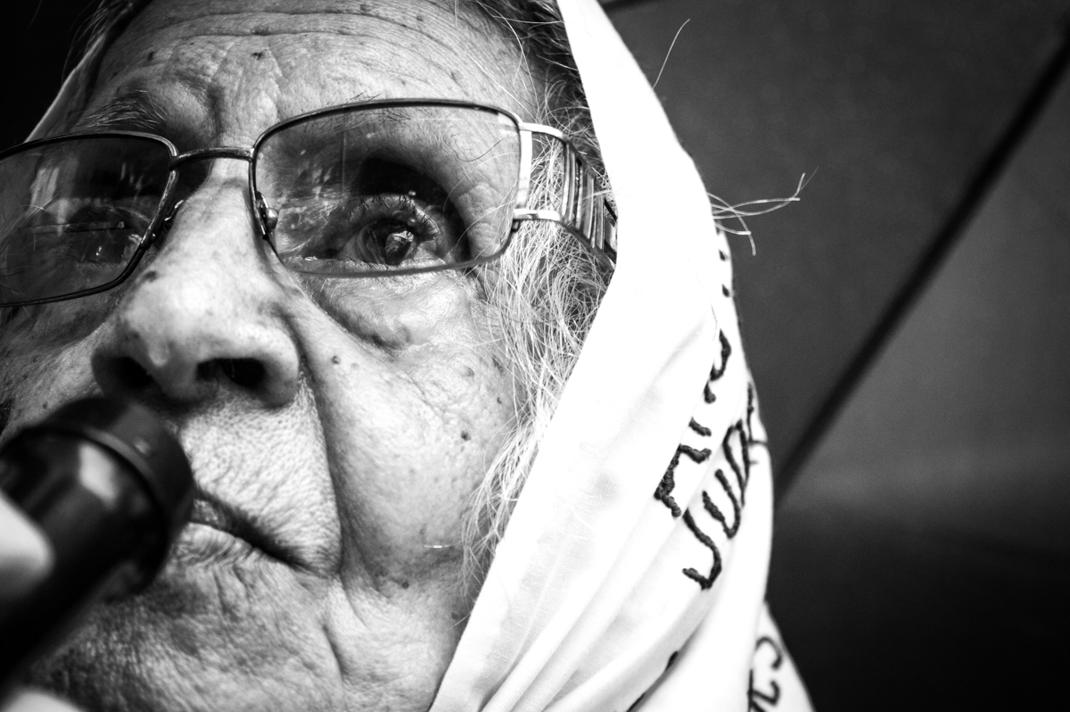 Madre de Plaza de Mayo. Abuela de Plaza de Mayo. Entra a la plaza, camina lento, pasa desapercibida, nos mira y nos saluda. Nos dice: acá estamos, chicas. Me da miedo abrazarla, sólo atino a acariciarle la espalda, imitando torpemente un abrazo que quisiera que sea el más fuerte jamás dado, pero que no podrá igualarse al que ella guarda en su cuerpo para su nieta/nieto, desde hace 41 años. (Texto y fotos de Agustina Salinas para La Retaguardia)