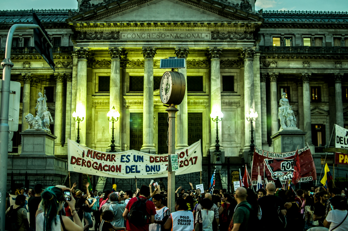 El DNU 70/17 establece que las personas migrantes que hayan sido condenadas o estén cumpliendo condenas, o con antecedentes penales, no podrán ingresar ni permanecer al país. Incluso afecta también a las radicaciones ya otorgadas. También modifica los trámites de expulsión para que sean inmediatos, sin posibilidad de defensa legal adecuada, elimina la unidad familiar y el arraigo como condiciones que evitan la expulsión. Esto además de equiparar y vincular la migración con la delincuencia es una herramienta de control social, donde quienes quedan más expuestas son personas migrantes de escasos recursos económicos y militantes sociales. La amenaza de la deportación reducirá la posibilidad de poder conseguir un trabajo estable, orillándonos a la precariedad, a ser todavía más vulnerables al hostigamiento de las fuerzas policiales, reducirá también la inserción escolar y el acceso al sistema de salud. A la vez esta amenaza intenta amordazar a las colectividades minando la posibilidad organizativa y de denuncia, de reclamo y defensa de nuestros derechos. Además es anticonstitucional porque el presidente no puede emitir un DNU en materia penal.