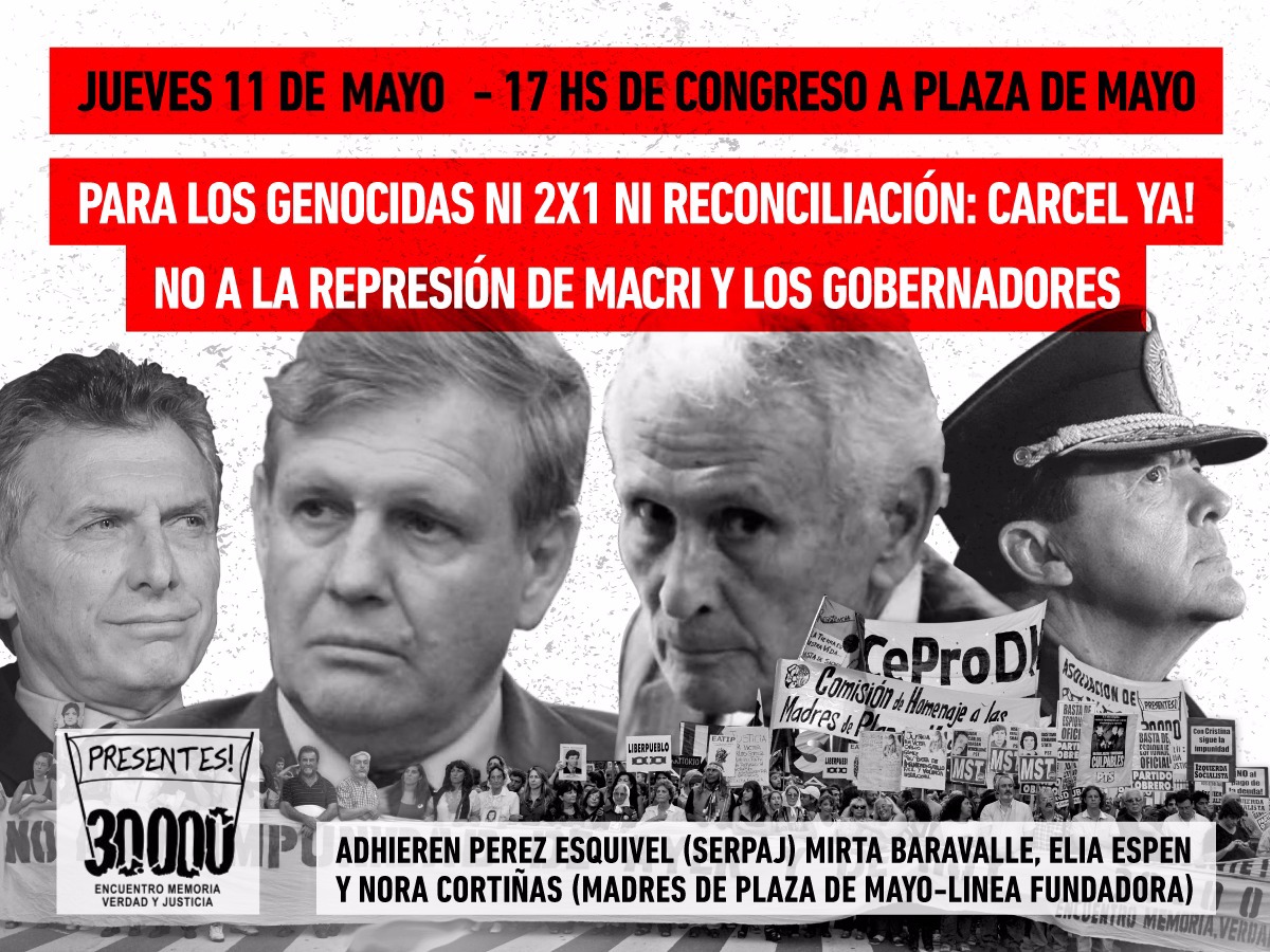 “La absurda pretensión de imponer el 2×1 que es una ley derogada en el 2001, para beneficiar a los genocidas de la dictadura va a encontrar la férrea resistencia de nuestro pueblo que supo enfrentar las leyes de obediencia de vida, punto final y los indultos de Menem en la calle que es donde corresponde. Por eso, el jueves 11 de mayo vamos a marchar de Congreso a Plaza de Mayo para exigirle al gobierno que anule esta nueva pretensión de imponer el 2×1 a los genocidas y que cese la represión tanto a nivel nacional como provincial”.