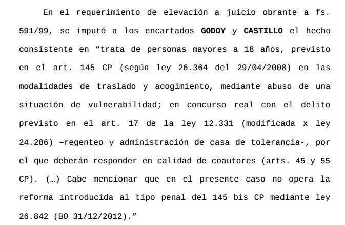 Los imputados pudieron valerse de la probation porque en el caso de Godoy y Castillo la pena máxima en caso de ser declarados culpables sería de tres años, porque no se aplica en este caso la reforma a la ley de trata, que quitó el consentimiento de la víctima como necesario para el delito y aumentó las penas.