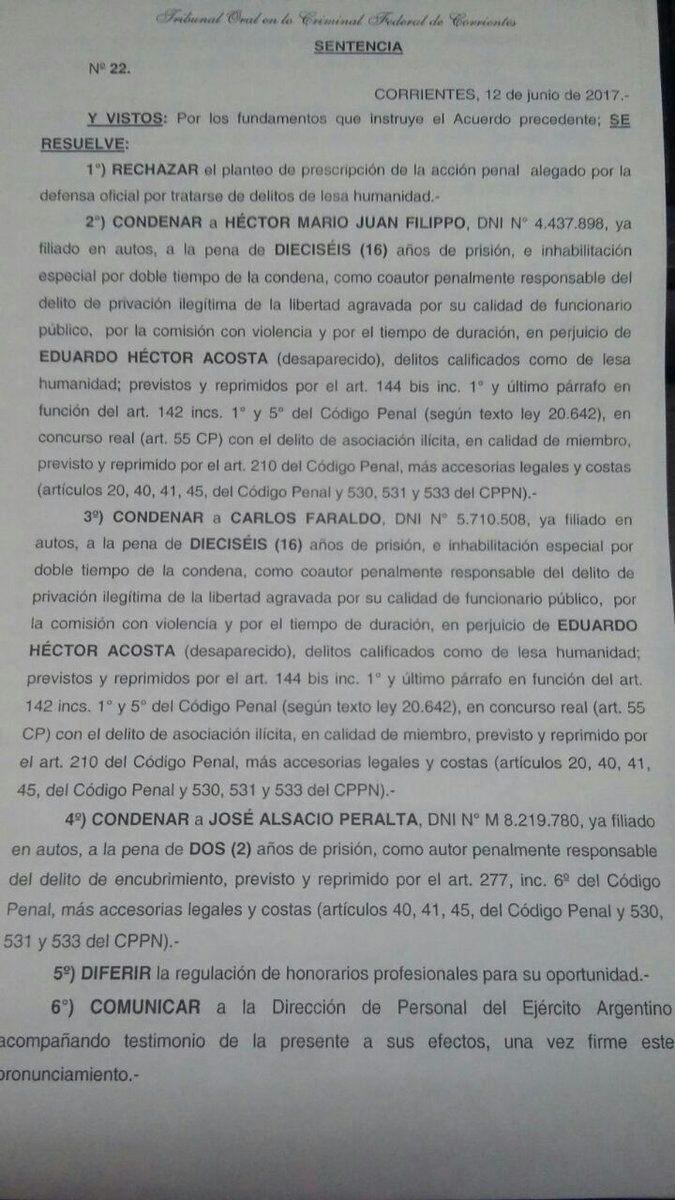 ºMumbach comenzó contando el hecho que se investigó en el juicio: la desaparición de “Pata” Acosta que ya se encuentra en su etapa final: “Este juicio es por la desaparición de Héctor «Pata» Acosta, un estudiante secundario. El 22 de marzo de 1976 fue retirado de su casa en horas de la madrugada y hasta el día de hoy lo estamos buscando. Se elevó un juicio en el año 2012 y se logró una sentencia de 16 años de prisión a quien fuera en ese momento el jefe del SIDE, el servicio de inteligencia de Paso de los Libres. (Ángel Raúl) Portillo está cumpliendo prisión en este momento. Ahora tenemos una segunda instancia. Nosotros le llamamos pata residual porque vendría a ser un desprendimiento de esa primer causa. Lo que se está tratando es de condenar a los autores materiales de este secuestro, desaparición y, por supuesto -todos lo sabemos-, asesinato de Héctor «Pata» Acosta. Muchos de los que formaron parte de la patota que actuaba en toda esta zona ya no están más con nosotros, fallecieron, pero hemos logrado llevar a tres a juicio oral en el Tribunal Oral Federal de Corrientes, que queda a 400 kilómetros de Paso de los Libres. Lamentablemente nos pasa que en las provincias tenemos que ir hasta las capitales para llevar adelante estos juicios, cuando lo ideal sería que sucedan en las localidades donde se dieron los hechos para que la ciudadanía pueda acompañar y tomar mayor relevancia estos juicios. En este momento se está llevando adelante. Fue un juicio bastante corto porque ya se tomó todo lo que se produjo en el 2012. Lo que se hizo ahora fue tratar de no volver a llamar a todas las víctimas y a todos los testimonios porque es una forma de volver a hacer vivir estas etapas y situaciones tan complejas y tan difíciles. Así que se tomó el testimonio que ya había sido dado en el primer juicio y se hizo lectura en este juicio actual. Solo se agregaron tres o cuatro testimonios más. Otros testimonios que se habían tomado en el Tribunal de Paso de los Libres fueron también incorporados por lectura ya sea porque fallecieron las personas que los hicieron en el 2013, después de haber culminado el primer juicio, o porque son personas de avanzada edad. La mayoría son ex militares. Unos eran de la Policía Federal, otros eran de la Policía Provincial y otros del Ejército. O sea, personal que trabajaba en esta zona. Se hizo el alegato el lunes pasado y se pidieron 16 años de prisión tanto para (Héctor Mario) Filippo como para (Carlos) Faraldo que forman parte de la patota y que ya están cumpliendo 25 años de prisión por otra causa. Se incorporó una nueva persona que era en ese momento el que estaba a cargo de la Policía Provincial, la que daba el espacio para que estas situaciones ocurran y era el nexo entre el SIDE y la localidad de Paso de los Libres. Ese señor, (José Alsacio) Peralta, está libre. Es la primera vez que entró a juicio. Para él se pidieron 6 años, eso lo que pidió la querella” informó.