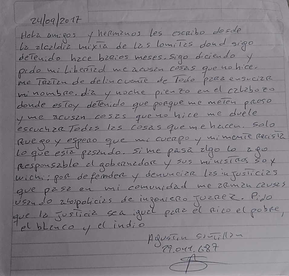 Hola amigos y hermanos, les escribo desde la Alcaldía mixta de Las Lomitas donde sigo detenido hace varios meses. Sigo diciendo y pido mi libertad. Me acusan de cosas que no hice, me tratan de delincuente, de todo para ensuciar mi nombre. Día y noche pienso en el calabozo donde estoy detenido que porque me meten preso y me acusan de cosas que no hice, me duele escuchar todas las cosas que me hacen. Sólo ruego y espero que mi cuerpo y mi mente resistan lo que está pasando. Si me pasa algo, hago responsable al gobernador y sus ministros. Soy wichí, por defender y denunciar las injusticias que pasan en mi comunidad me arman causas usando a los policías de Ingeniero Juárez. Pido que la justicia sea igual para el rico, el pobre, el blanco y el indio.