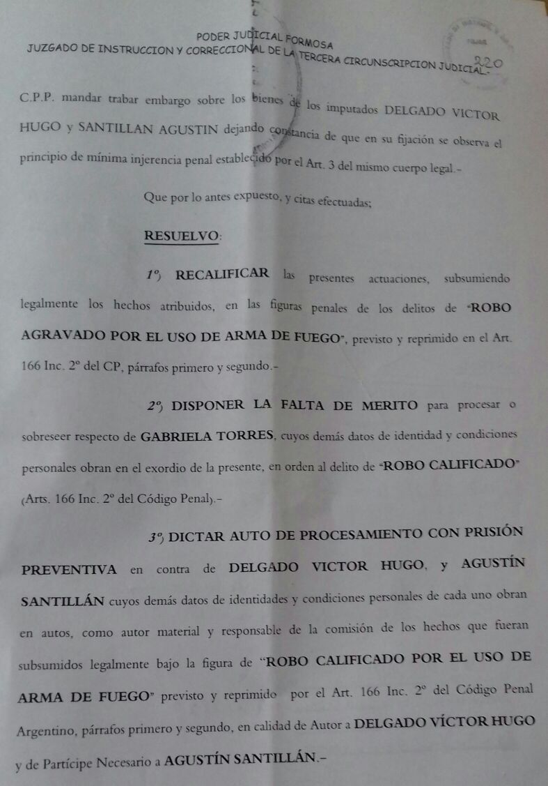 Ahora Santillán y Víctor Hugo Delgado fueron procesados por «Robo calificado por el uso de arma de fuego». En la misma causa el juez le dictó la falta de mérito a Gabriela Torres, la esposa de Santillán; o sea que no fue procesada, pero López Picabea se dejó la puerta abierta para procesarla en otro momento al no sobreseerla, solo le dictó la falta de mérito.