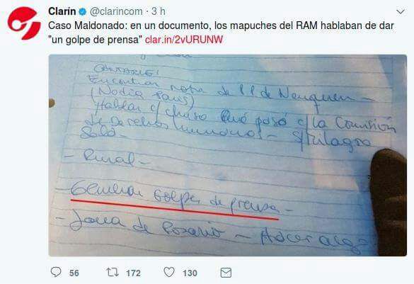 La nota escrita a mano y de carácter privado que publicó el diario Clarín fue robado por Gendarmería el 31 de agosto en el marco de la detención ilegal de la vocera Soraya Miacoño, cuando “los lamgnen estaban siendo reprimidos y apresados en Bariloche por orden del propio juez Villanueva y desde el mismo juzgado sale un operativo de Gendarmería que se va a instalar a las puertas de la Pu Lof, Soraya trata de llegar al ingreso en la ruta y ahí un operativo de Gendarmería con Nocetti a la cabeza la secuestran por más de 30 horas con otra lamgnen, les quitan los teléfonos, les sacan todos los papeles que tenían encima, dejándole bien claro que las iba a dejar el tiempo que las tuviera que dejar y que iba a hacer lo que quisiera con ellas”, describió París en charla con el programa de la Red Nacional de Medios Alternativos.