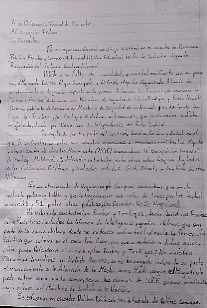En la misiva, el Lonko mapuche hizo referencia al rechazo explícito a todas las pruebas y testigos presentados, y acusó al juez y a los fiscales de actuar bajo presiones de los “Ministerios de Seguridad de Chubut y Rio Negro y Pablo Noceti (Jefe de Gabinete de Asesores del Ministerio de Seguridad de la Nación), dando por tierra con la independencia del Poder Judicial”. Además denunció la complicidad de la justicia en la desaparición forzada de Santiago Maldonado en el marco de una represión ilegal: “Contemplando que fue parte del contexto Jurídico, Político y Social en el que la confrontación entre sus aparatos represivos y comuneros-militares Mapuche y simpatizantes de nuestro Movimiento (M.A.P) desencadenó la “Desaparición Forzada “de Santiago Maldonado, 9 detenidos en Bariloche, 7 detenidos en Buenos Aires, entre otros hechos trágicos digitados entre funcionarios políticos y judiciales incluidos Guido Otranto y también Gustavo Villanueva”, escribió, agregando que “se esfuerzan en esconder delitos políticos tras la fachada de delitos comunes”.