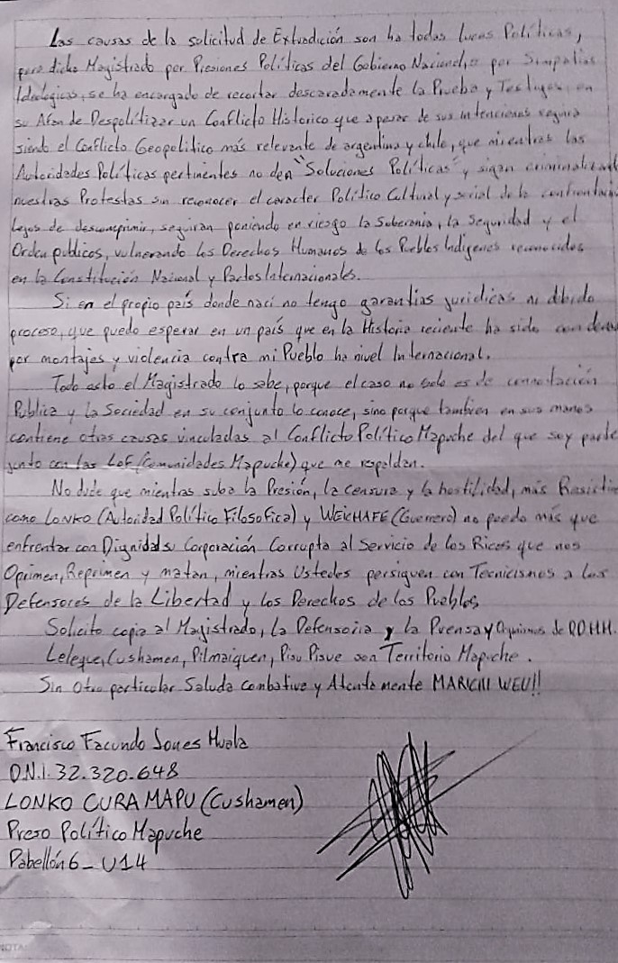 Sobre la solicitud de extradición de Jones Huala a Chile, el prisionero mencionó que se trata de un conflicto de índole política que atraviesa las históricas violaciones a los derechos humanos de los pueblos indígenas, avaladas por el Gobierno: “Las causas de la solicitud de extradición son a todas luces políticas, pero dicho magistrado por presiones políticas del Gobierno Nacional, o por simpatías ideológicas, se ha encargado de recortar descaradamente la prueba y testigos, en su afán de despolitizar un conflicto histórico que a pesar de sus intenciones seguirá siendo el conflicto geopolítico más relevante de Argentina y Chile, que mientras las autoridades políticas pertinentes no den “soluciones políticas” y sigan criminalizando nuestras propuestas sin reconocer el carácter político, cultural y social de la confrontación lejos de descomprimir, seguirán poniendo en riesgo la soberanía ,la seguridad y el orden público, vulnerando los Derechos Humanos de los Pueblos Indígenas reconocidos en la Constitución Nacional y Pactos Internacionales”, escribió.