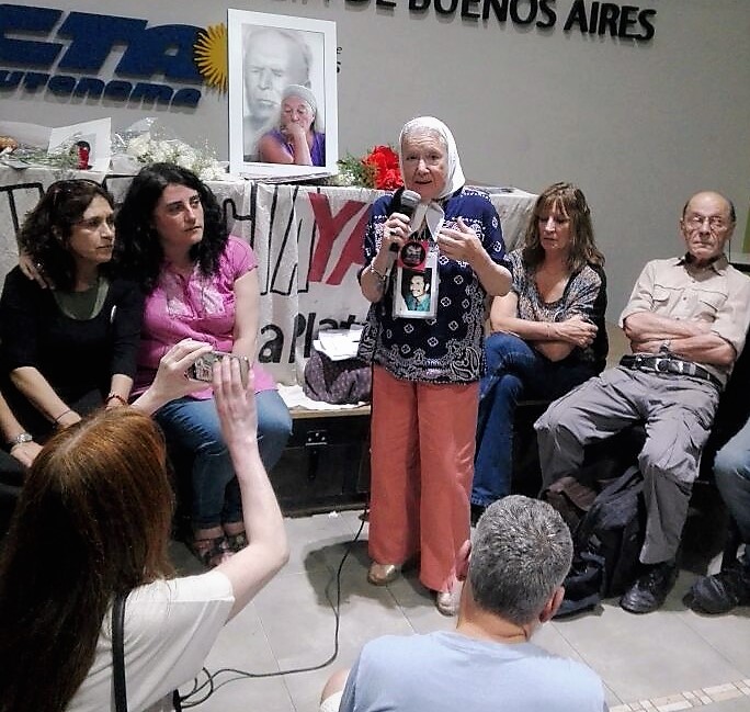 Nilda decidió irse de viaje y dejarnos. Algún día llegaremos. Ustedes no, pero nosotras estamos más cerca. A Nilda no la conocí tanto como muchos de ustedes, pero hoy escucho a las chicas jóvenes diciendo que aprendieron de ella. Quiero decirles a los ex detenidos desaparecidos, que las Madres todos estos años aprendimos de ellos. No sabíamos nada de nuestros hijos, nunca supimos nada. Preguntábamos ¿qué pasa, dónde están, cómo están?. Hace unos días, Sergio Maldonado me dijo «mi mamá está equivocada, me pregunta si Santiago tendrá frío, tendrá hambre» y yo le dije «no está equivocada, porque nosotras preguntábamos lo mismo». Mirábamos a la gente y le decíamos «¿Tendrá frío? ¿Le darán los remedios que tomaba? ¿Lo curarán si está lastimado?». Es siempre lo mismo, la misma historia. Cuando aparecían a la vida algunos de los desaparecidos, las Madres nos quedábamos en la oficina y los mirábamos y preguntábamos»¿A ver? ¿Tenés todos los dientes? ¿Cómo estás? Mirame». Guardo algo muy especial, que es que nunca nos dijeron el horror que vivieron. Tenían ese cuidado, esa ética, para que nosotras no tuviéramos más dolor todavía. Hace unos meses fui a un acto en Mar del Plata con Nilda, estaba sentada al lado de ella. Escuché el testimonio, es una cosa que me penetró adentro del alma porque nosotros a veces lloramos, en la Plaza, donde nos encontramos, y a veces el testimonio completo directo, sentada al lado, nos permite aprender. Aprendemos la verdadera historia de parte de ellos, de manera directa. Es dejar esa verdadera historia para las futuras generaciones, ¿por qué no bajaron los brazos? ¿Por qué decimos que no olvidamos, no perdonamos y no nos reconciliamos? Y lo decimos todos los días, y es convicción. Todo lo que hacemos nos sale de las vísceras. Nada es inventado ni creado. Yo quiero agradecerles de saber que nosotras con ellos aprendemos todos los días, nos colmamos de esta historia. Pensamos en nuestros hijos y nuestras hijas y los igualamos. Les agradecemos todos los días lo que hacen. Con Nilda, últimamente hemos estado más juntas, y la noche de los detenidos de la represión por Santiago, fue muy emocionante estar al lado de ella. Se imponía con fuerza lo que decía. Además se imponía al lado mío, yo me sentía chiquita, no sé por qué. Ella emprendió este camino, a lo mejor, todas las cosas que pasó le sirvieron en algún momento, todo lo que vivió en sus 60 años. Decir que vamos a seguir todos. Nosotros no somos los que delineamos el camino de ustedes, ustedes nos ayudan a que todos los días nos levantemos y salgamos a pelear. Por eso el compromiso es fuerte, mutuo, es abrazarnos. Es el país de los abrazos, porque cada vez que nos vemos nos toqueteamos, nos abrazamos. Escuché cosas lindas de las chicas jóvenes y escuché algo que me gustó. Yo siempre digo «juntos pero no revueltos» y hoy escuché «juntos pero no amontonados», me gustó más, porque no te aprieto.
