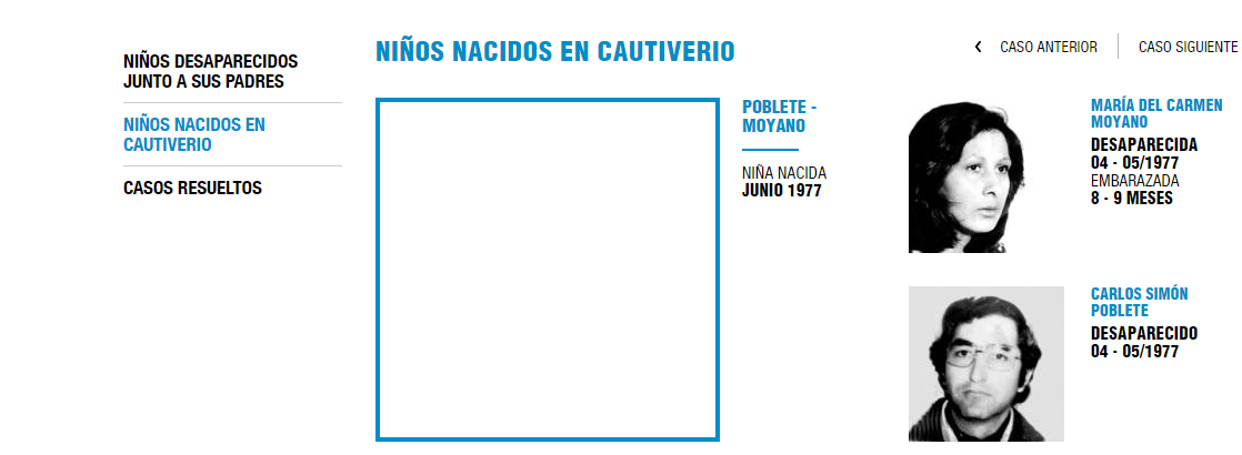 El Tula Poblete y Pichona Moyano eran militantes de Montoneros. Según informa Abuelas en su página, aún como un caso sin resolver, con la fotos de sus padres y el recuadro con la foto de la nieta recuperada aún en blanco, «María del Carmen nació el 9 de mayo de 1954 en la ciudad de Mendoza. Su familia la llamaba «La Gorda». Carlos nació en la ciudad de San Juan el 2 de noviembre de 1944. Ambos militaban en la organización Montoneros. Sus compañeros la llamaban «Pichona» y a él «Tula» o «Guillermo». La pareja fue secuestrada entre abril y mayo de 1977 en la ciudad de Córdoba. La joven estaba embarazada de ocho o nueve meses. Por testimonios de sobrevivientes pudo saberse que ambos permanecieron detenidos en el CCD «La Perla» de Córdoba y luego fueron trasladados a la ESMA. En dicho CCD, a fines de junio de 1977, María del Carmen dio a luz una niña atendida por el médico militar del Hospital Naval, Jorge Luis Magnacco».
