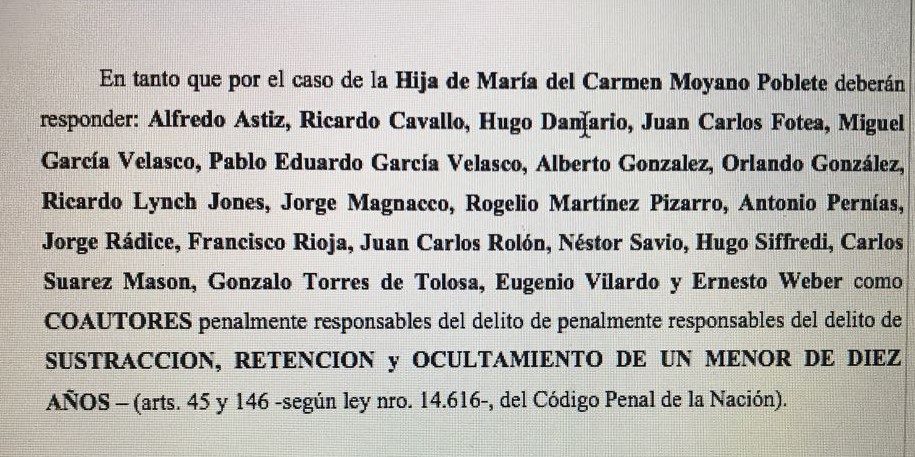 Soiza Reilly, en su alegató que duró más de seis meses, dijo sobre ellos: «Se ha acreditado que María del Carmen Moyano de Poblete fue privada ilegítimamente de su libertad con violencia y amenazas y sin las formalidades prescriptas por la ley, en el mes de abril de 1977, junto con su pareja Carlos Simón Poblete, en la Provincia de Córdoba, en un operativo efectuado por personal de las fuerzas de seguridad, perteneciente al Tercer Cuerpo del Ejército. Al momento de su detención, la víctima cursaba un embarazo de siete meses. María del Carmen habría permanecido detenida en el centro clandestino de detención denominado ‘La Perla’, ubicado en dicha provincia. Luego de una semana, fue trasladada al centro de exterminio y torturas que funcionó en el interior de la Escuela de Mecánica de la Armada. Allí fue atormentada y sometida a las condiciones inhumanas de detención existentes en dicho lugar, ya que estuvo alojada en el cuarto de las embarazadas esposada, con grilletes en los pies, con escasa alimentación y con una grave restricción para responder adecuadamente a sus necesidades fisiológicas. Este cuadro de situación se vio agravado, en primer lugar, por el estado de gravidez en que se encontraba al momento de ser secuestrada; en segundo lugar, por haber dado a luz dentro del CCD; y, en tercer lugar, por haber sido separada violentamente de su hija recién nacida. Su hija, aún no identificada, nació en la ESMA, en el mes de junio de 1977, con la asistencia de los médicos Magnacco y Martínez Pizarro. Una semana después del alumbramiento, María del Carmen fue sacada de la ESMA, sin su hija. Aún permanece desaparecida». Cabe acotar que Magnacco recibió 14 años de prisión como condena en el juicio. Luego del juicio pidió acceder al beneficio de la libertad condicional, que le fue concedida, por lo que podríamos cruzarlo portando su tobillera electrónica, que controla sus movimientos, pero no sus acciones y pensamientos oscuros de genocida.
