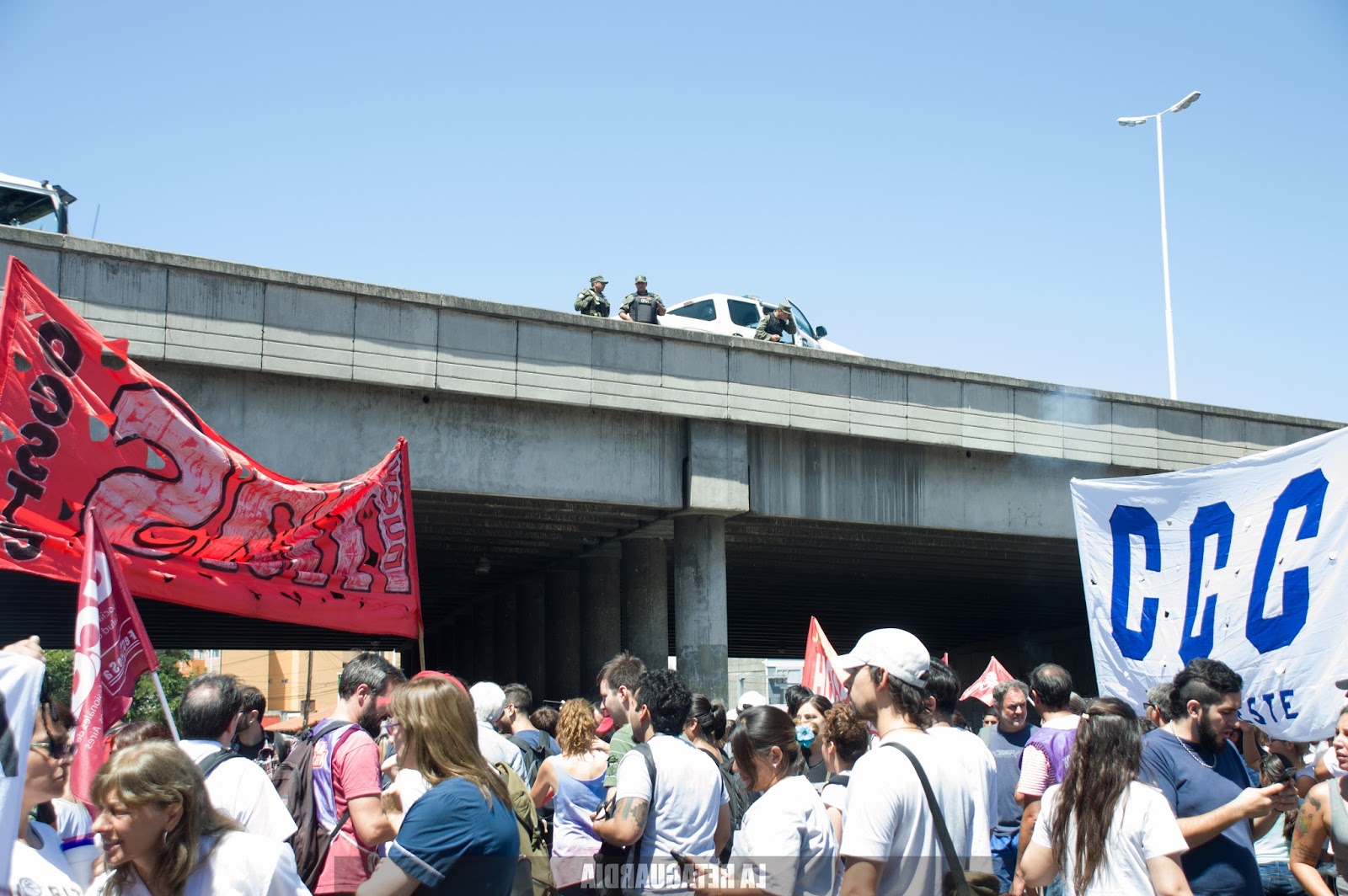 La jornada concluyó con un corte en la colectora de Acceso Oeste y una vuelta por el hospital. Abajo de la autopista, la Policía custodió que el corte no se extendiera. Arriba, Gendarmería esperaba alerta por si se intentaba subir.