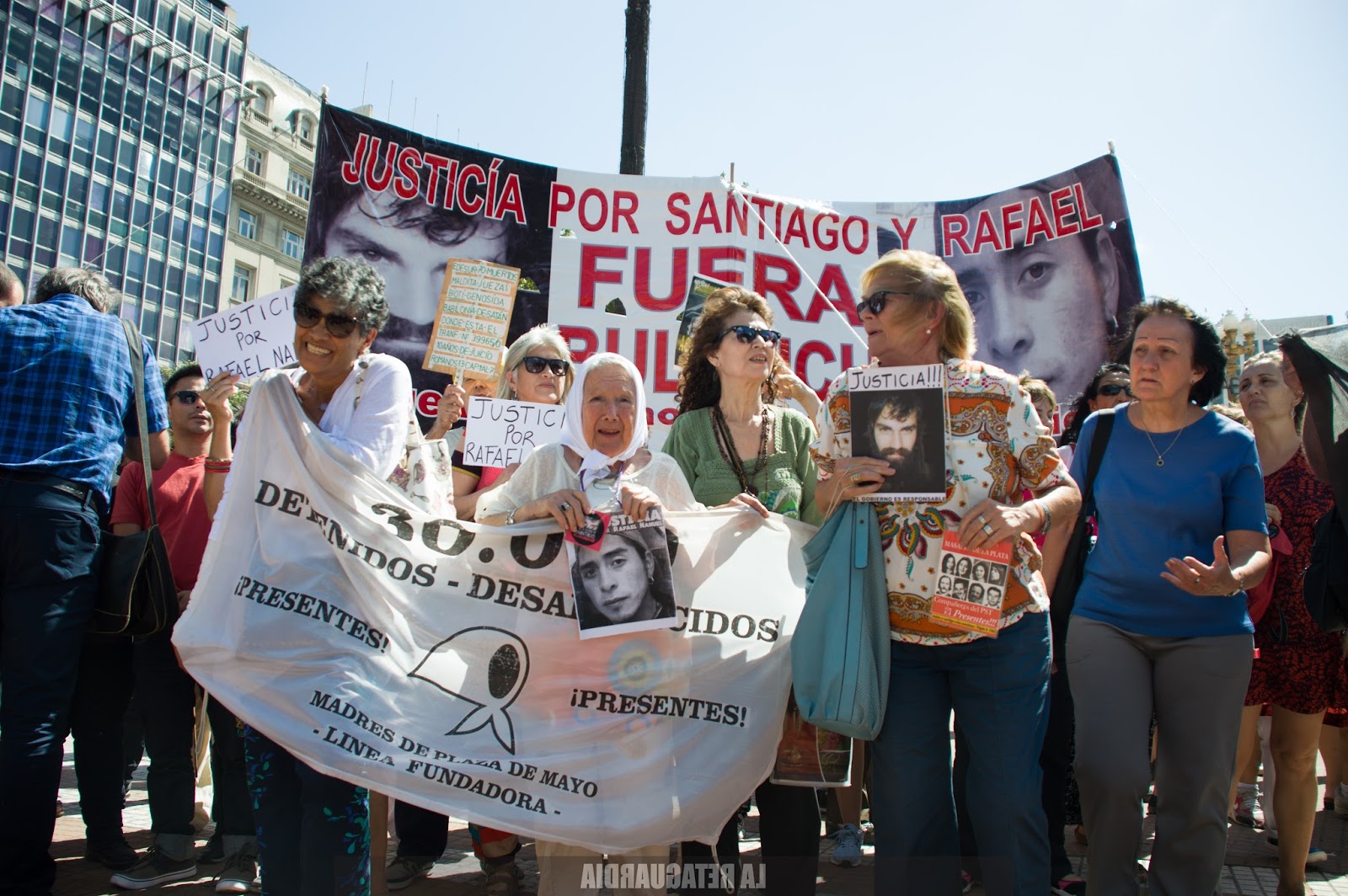 Pablo Pimentel, presidente de la Asociación Permanente por los Derechos Humanos La Matanza, habló con Nora Cortiñas acompañándolo, y contextualizó el foco del conflicto del actual Gobierno con los pueblos originarios, que derivó en escaladas cada vez más represivas, la desaparición seguida de muerte de Santiago y el fusilamiento de Rafael: “A partir del 2015 se instaló en la Patagonia la AFI, Agencia Federal de Investigaciones, para ver de qué manera le liberaban las tierras a los terratenientes, dueños y latifundistas como Benetton y como Goleáis, para desarrollar un negocio que les deja mucho dinero: la explotación minera o petrolera. Quieren dejar libres esos territorios de sus verdaderos dueños. En un informe desastroso que lamentablemente parte de los argentinos han comprado, han creado al ‘enemigo interno’. Justamente, para poder implementar esta política de ajuste, para poder echar por cualquier lado a estatales, a gente de la salud, de los derechos humanos y sobretodo los sectores más pobres. Dentro de los sectores más pobres, a los pueblos originarios. Sobre todo a los que luchan y tienen muy claro cuáles son sus derechos. Son jóvenes que se están empoderando y están ejerciendo esos derechos que de alguna manera le hemos infundido las Madres, las Abuelas y quienes estamos en organismos de derechos humanos. Les están contestando con cárceles, con balas, con desapariciones”, expresó Pimentel.