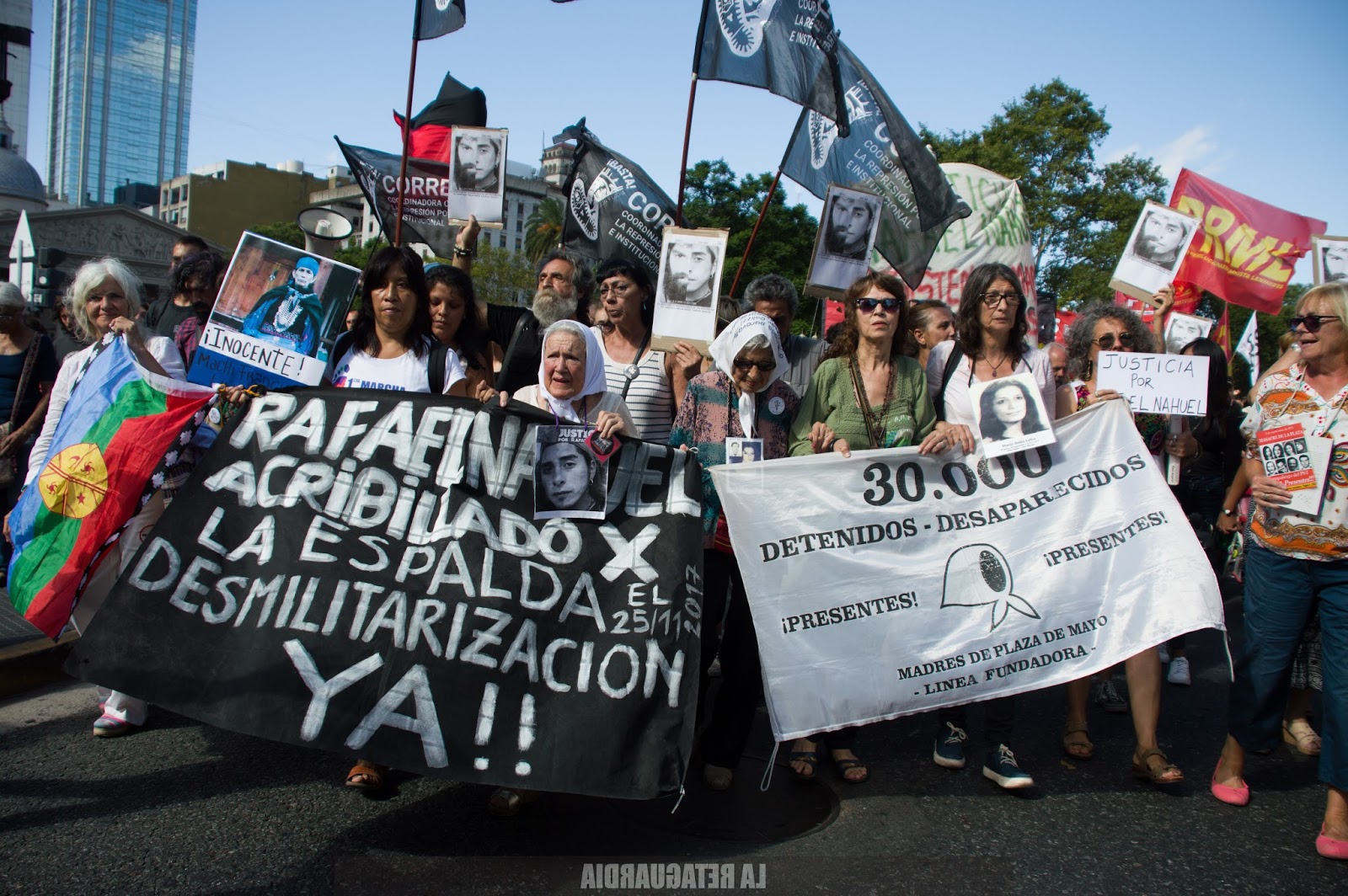 La marcha encabezada por Nora Cortiñas, Mirta Baravalle, y otros referentes de Derechos Humanos, partidos políticos y organizaciones sociales, llevaba una bandera negra con letras blancas: “Rafael Nahuel asesinado por la espalda. Desmilitarización ya”.