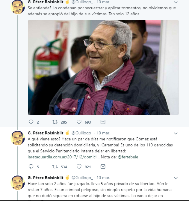 Guillermo Pérez Roisinblit es uno de los nietos recuperados por Abuelas de Plaza de Mayo. Es hijo de Patricia Roisinblit y José Manuel Pérez Rojo, militantes de la columna oeste de Montoneros. Sus padres fueron secuestrados y desaparecidos. Guillermo nació en cautiverio, en la ESMA, en noviembre de 1978. Desde ese momento fue apropiado por Francisco Gómez, personal civil de un grupo de inteligencia de la Fuerza Aérea que operó en la zona oeste del gran Buenos Aires. La identidad de Guillermo fue restituida en el 2000. Cuando se encontró con que el nombre de su apropiador estaba en el listado de genocidas propuestos por el SPF para acceder al beneficio de la prisión domiciliaria publicado por La Retaguardia en diciembre del año pasado, sintió miedo y enojo, “una mezcla de sensaciones que no me va alcanzar el tiempo para contar”. Lo que si contó fueron los juicios que condenaron a su apropiador y su participación en ellos: “Lo peor de todo es que el listado lo vi en conjunto con la ratificación del pedido del beneficio del arresto domiciliario. Francisco Gómez afrontó dos procesos judiciales. El primero tuvo condena en el año 2005, por mi apropiación. Solamente le dieron 7 años y medio. Todavía las penas no se habían endurecido. Todavía los derechos humanos no eran políticas de Estado del gobierno. El segundo fue en el año 2013. A mí me citó a declarar el juez (Daniel) Rafecas en Instrucción. Yo declaré todo lo que él me contó de su boca con respecto al cautiverio de mis padres. A los tres días quedó detenido. El juicio se desarrolló en el año 2016. Se conoció como juicio RIBA, la Regional de Inteligencia Buenos Aires que tuvo el epicentro represivo en zona oeste y estuvo a cargo de la Fuerza Aérea. Gómez era personal civil de la Fuerza Aérea, de inteligencia”, explicó Guillermo, que no se quedó de brazos cruzados esperando que su apropiador reciba el beneficio sino que dio a conocer la situación a través de las redes sociales: “Mis amigos me comentaron del listado. Lo empecé a buscar y encontré la nota. Me empecé a llenar de bronca y de miedo. Más tranquilo me senté a escribir el tuit que jamás pensé que iba a tener la trascendencia y que se iba a viralizar como se hizo”, expresó. El mensaje de Twitter al que hace referencia Pérez Roisinblit es, en realidad, una serie de tuits donde cuenta sobre su infancia bajo la apropiación de Gómez, la violencia y las amenazas del genocida y la restitución de su libertad en el año 2000. Allí hace referencia al listado del SPF y a la posibilidad de que el represor accediera al beneficio de la prisión domiciliaria: “¿A qué viene esto? Hace un par de días me notificaron que Gómez está solicitando su detención domiciliaria, y ¡caramba! es uno de los 110 genocidas que el Servicio Penitenciario intenta dejar en libertad». «Es un criminal peligroso, sin ningún respeto por la vida humana que no dudó siquiera en robarse al hijo de sus víctimas. ¿Lo van a dejar en libertad?», escribió en la red social hace casi un mes.