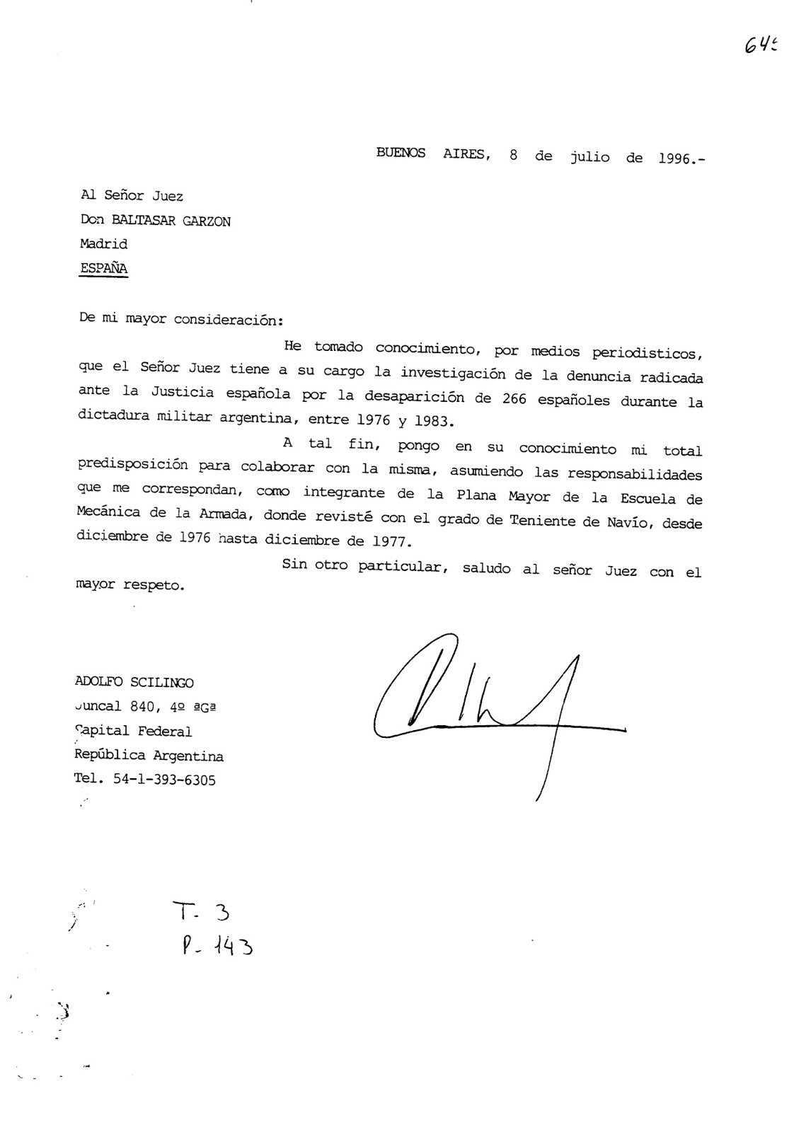 | Carta en la que Scilingo ofrece su testimonio al juez Baltasar Garzón. |