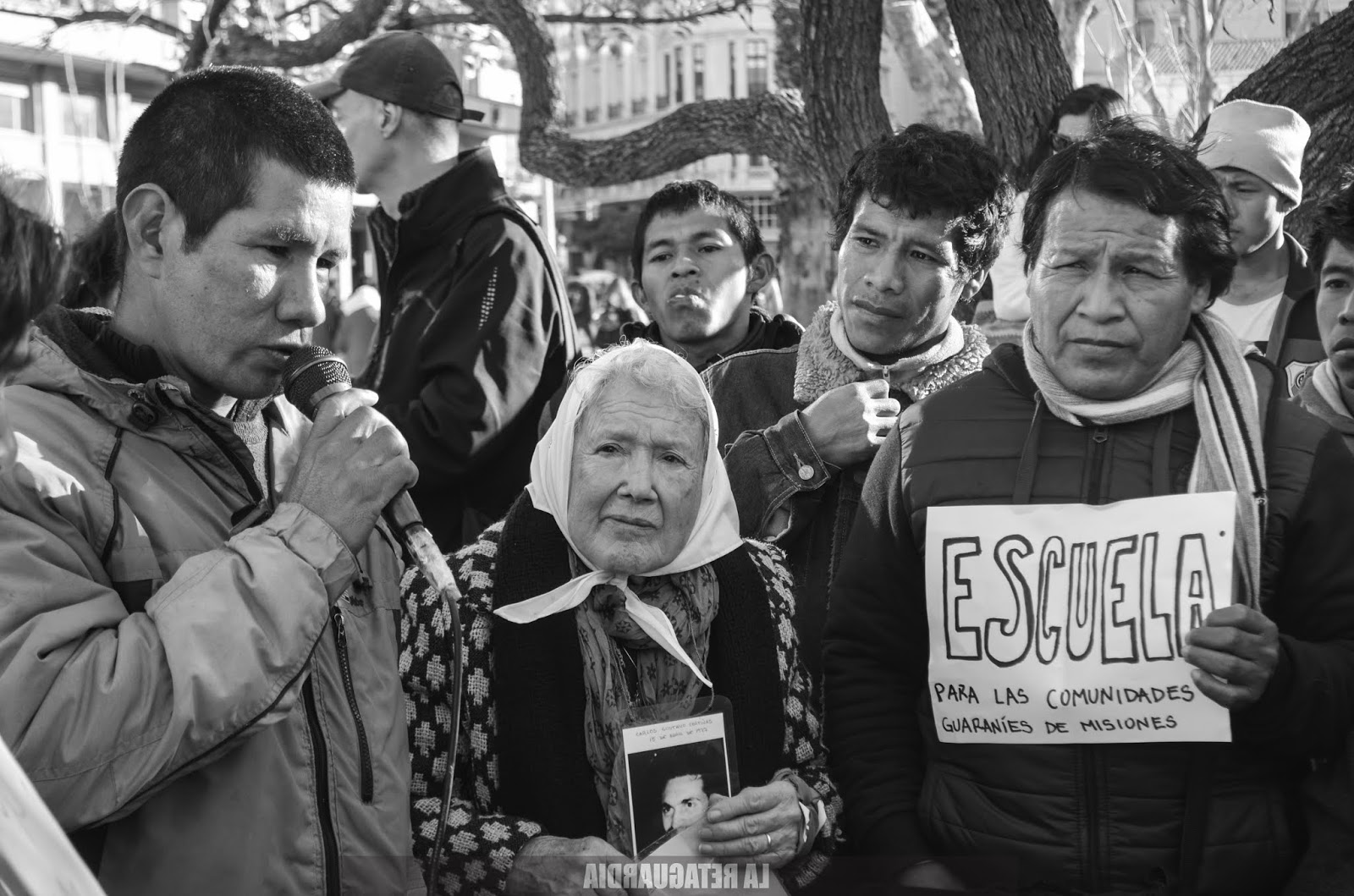 Integrantes de dieciocho comunidades guaraníes y de cuatro comunidades agrarias de la provincia de Misiones estuvieron en la ronda de Madres de Plaza de Mayo, vinieron a reclamar por su territorio, por escuelas, por educación bilingüe e intercultural y atención médica para sus comunidades. Una abuela de una de las comunidades dio sus bendiciones para todos. “Que la lucha siga adelante para todos, no son solo los pueblos originarios los que necesitan, sino también hermanos como ustedes de Buenos Aires, de la Capital. Estamos con los 44 tripulantes también apoyando a que se los escuche”, dijo uno de los integrantes de la comitiva.