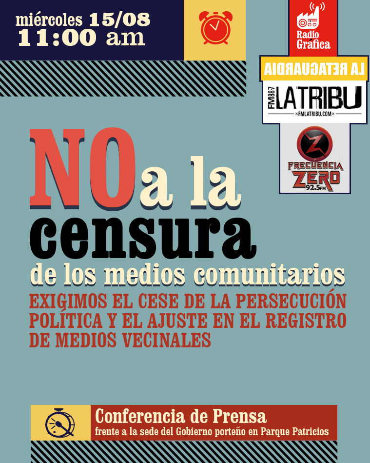El miércoles 15 de agosto a las 11 de la mañana, haremos una conferencia de prensa frente a la sede del Gobierno porteño en Parque Patricios, con representantes de cada medio, para denunciar esta persecución y dar cuenta de la gran solidaridad que supimos construir en años de trabajo.