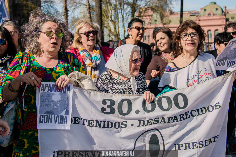 En el documento leído también se menciona la prisión domiciliaria que obtuvo Etchecolatz: “Fue gracias a la inmediata denuncia y a la masiva respuesta popular que logramos hacer volver atrás semejante beneficio”.  A lo que Nora Cortiñas agregó: “Y hay que exigir justicia por todos los desaparecidos durante gobiernos constitucionales, por Santiago Maldonado, por Rafael Nahuel, todos los días”.