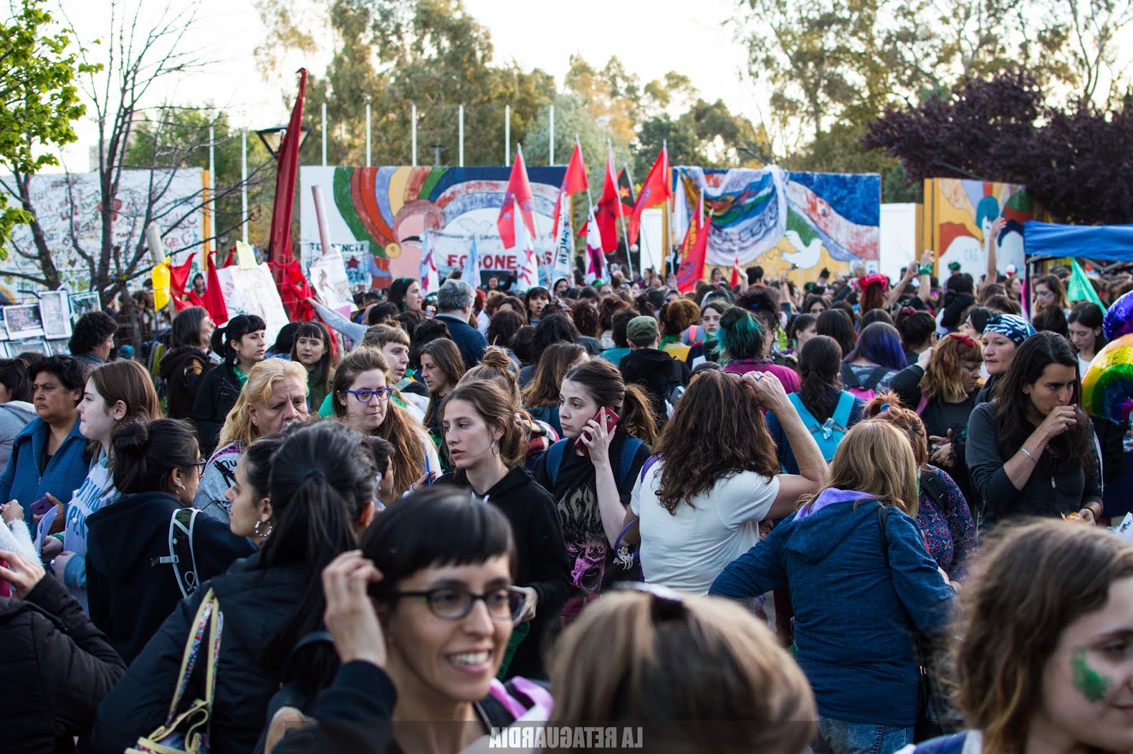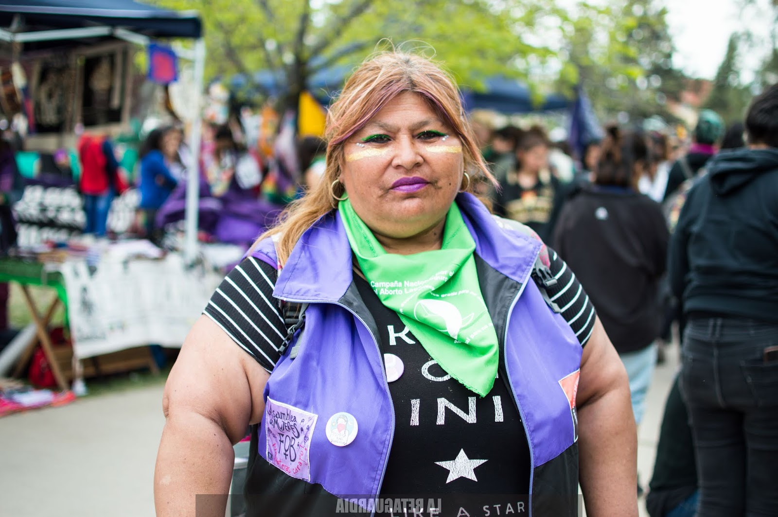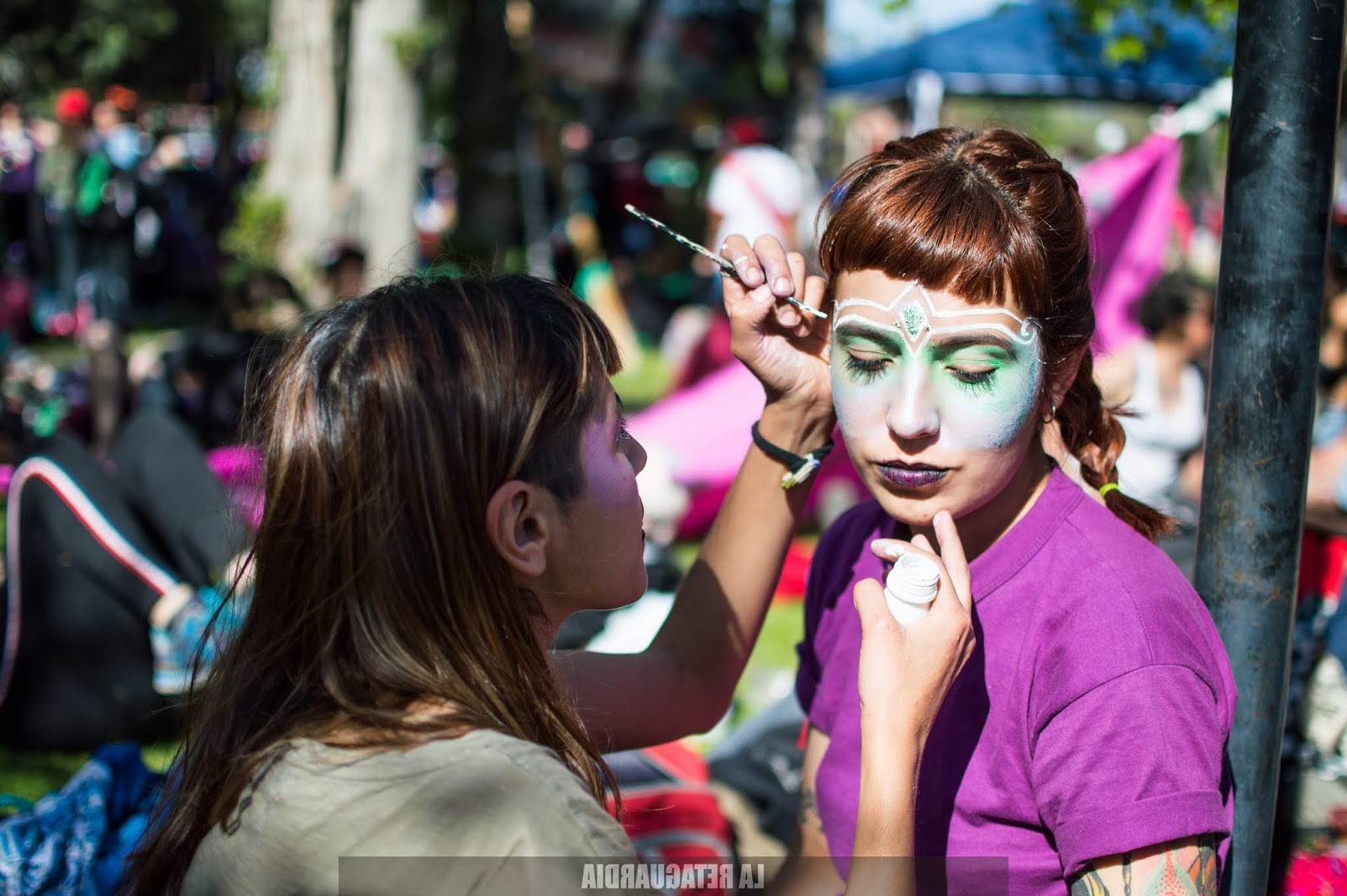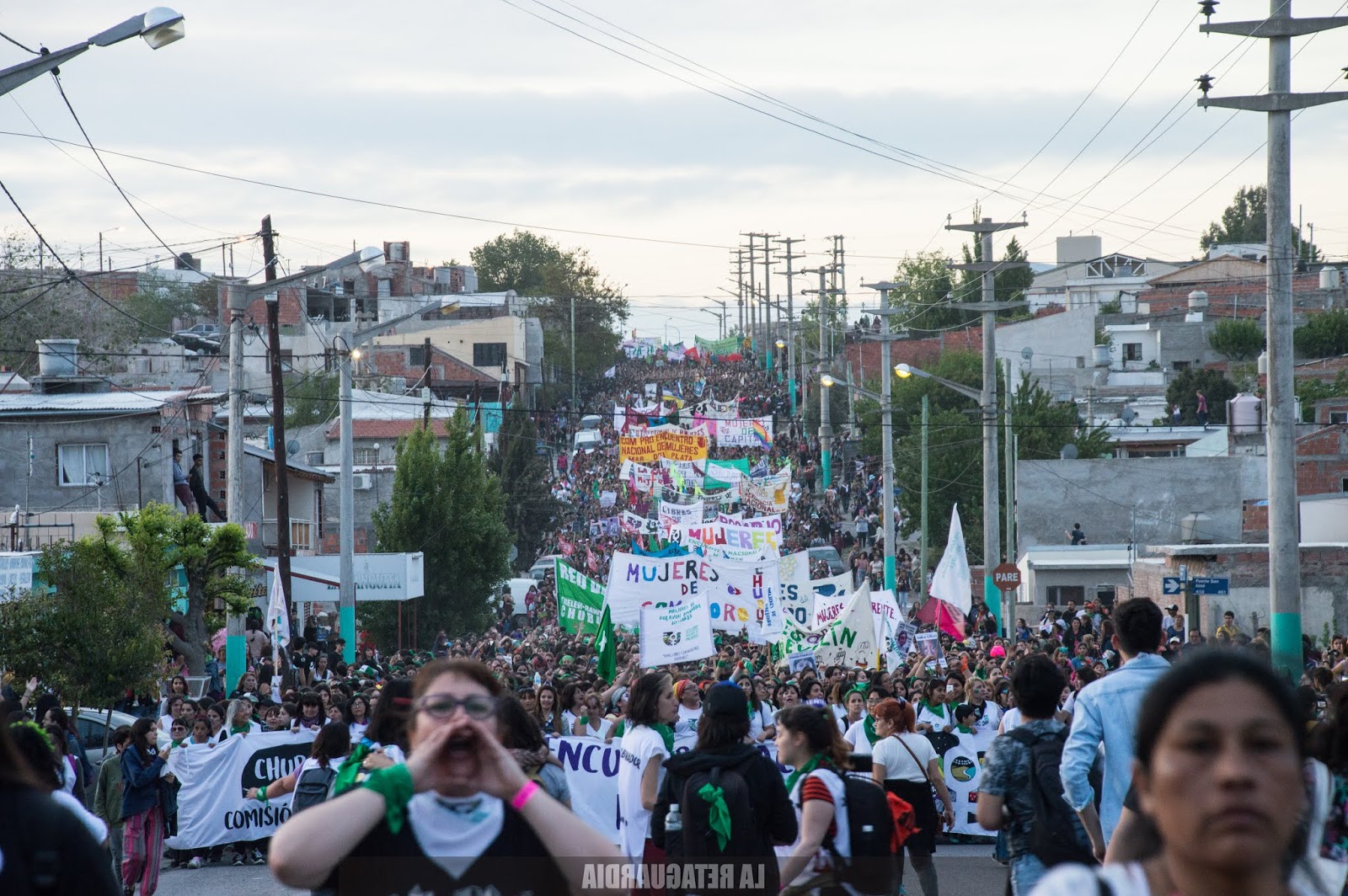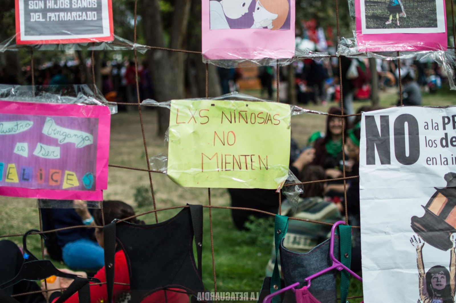 Y llegó el domingo. El sol quemaba un poco más pero el viento lo apaciguaba y con la tierra que arrastraba nos rozaba los cuerpos palpitando la marcha. Las trenzas cosidas, los brillos verdes, violetas, rosas. La intervención artística en su esplendor: los rostros, las panzas, los cuellos, las manos. Todos los cuerpos politizados: se expresan con el pañuelo, las remeras, las banderas sobre los hombros, los pelos pintados.