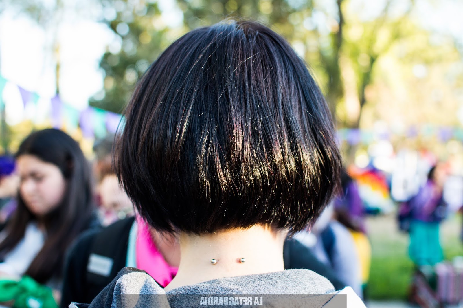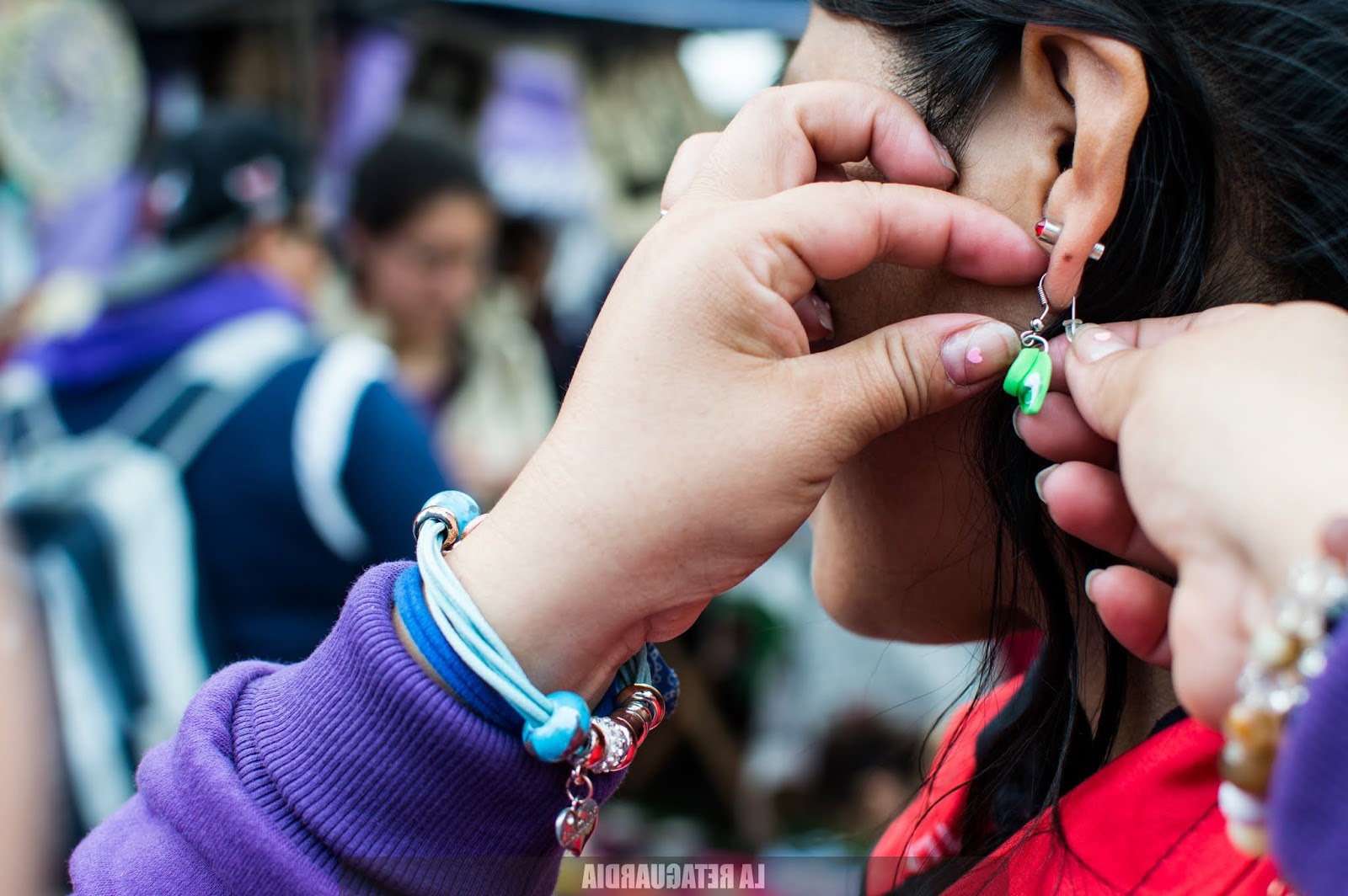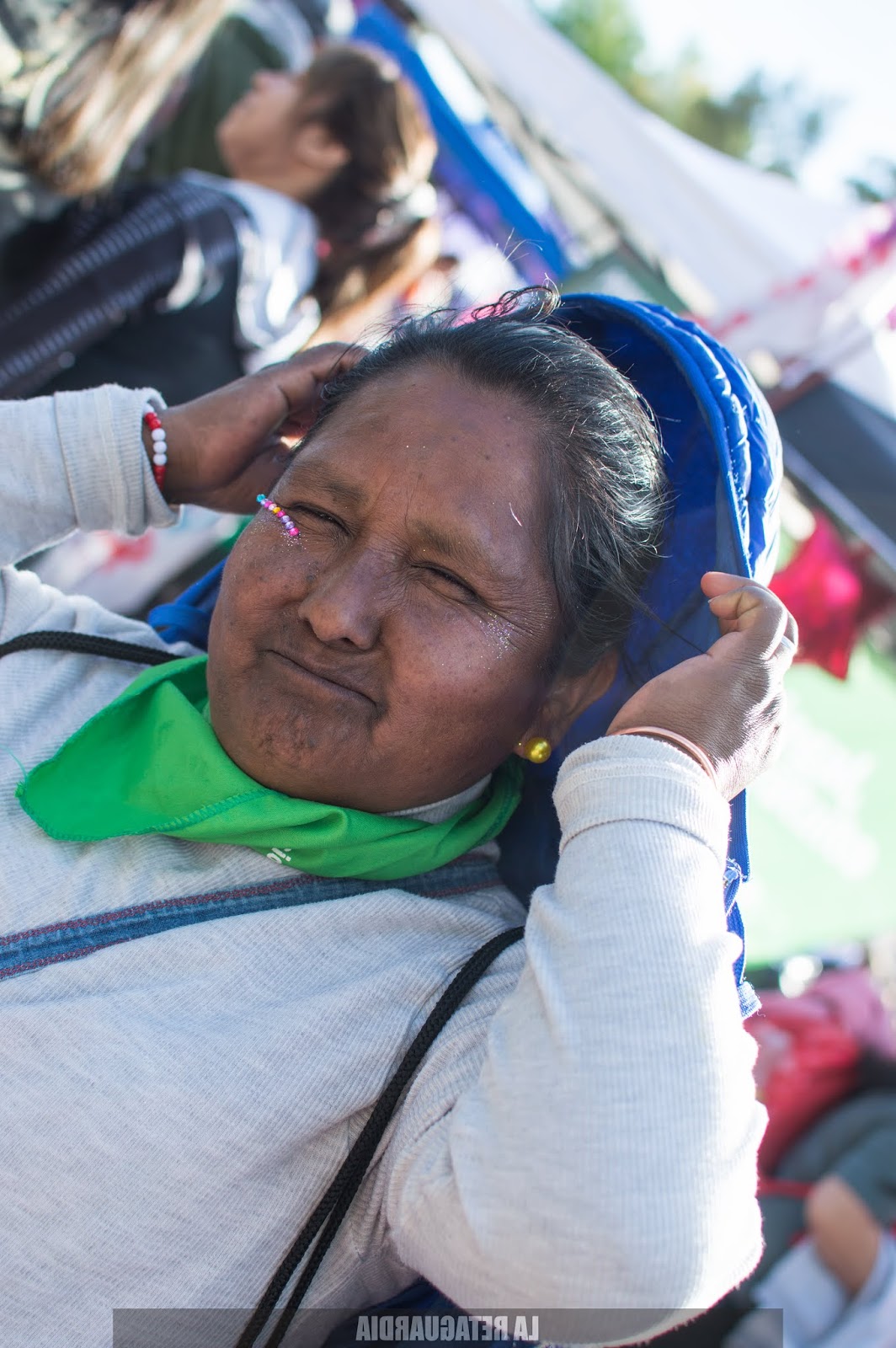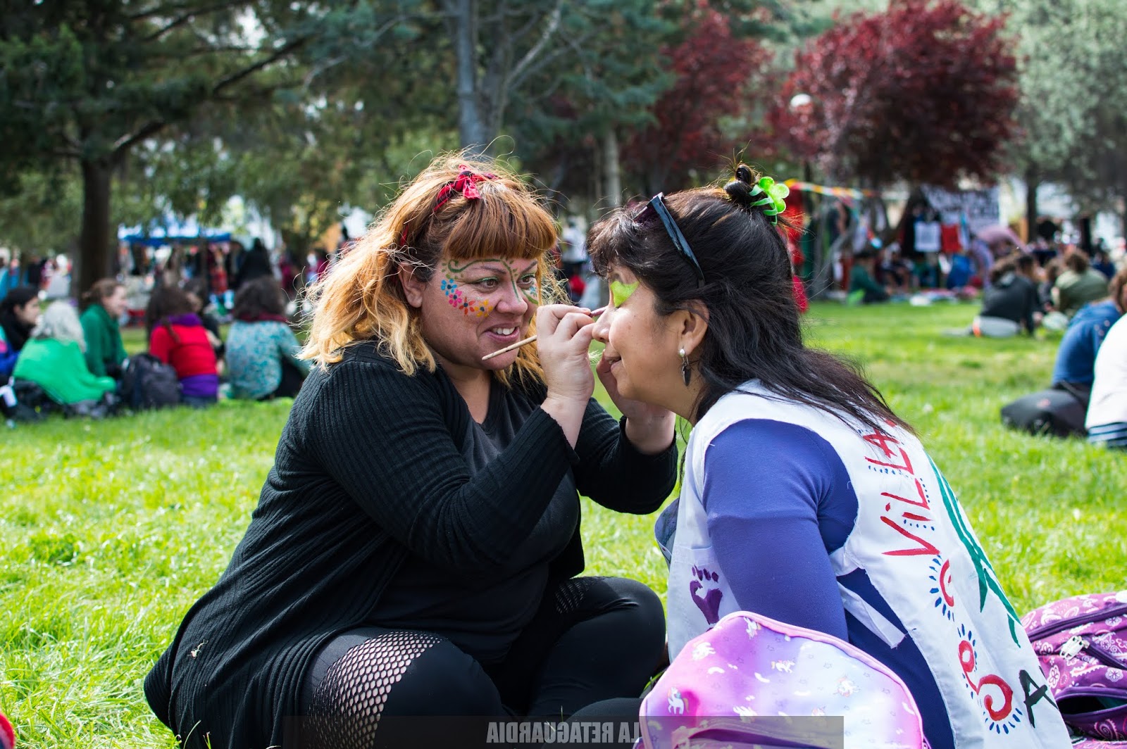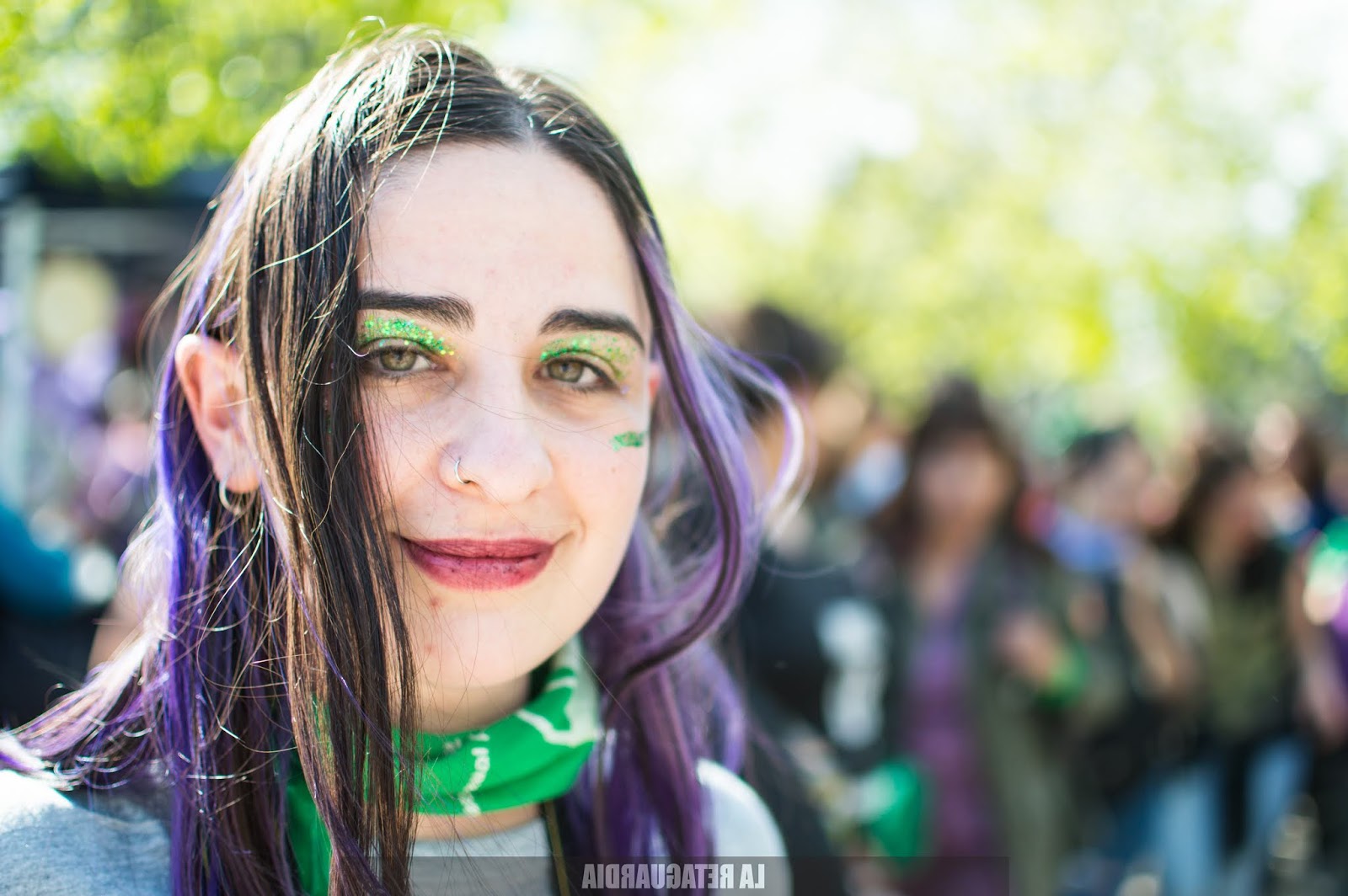 Y llegó el domingo. El sol quemaba un poco más pero el viento lo apaciguaba y con la tierra que arrastraba nos rozaba los cuerpos palpitando la marcha. Las trenzas cosidas, los brillos verdes, violetas, rosas. La intervención artística en su esplendor: los rostros, las panzas, los cuellos, las manos. Todos los cuerpos politizados: se expresan con el pañuelo, las remeras, las banderas sobre los hombros, los pelos pintados.