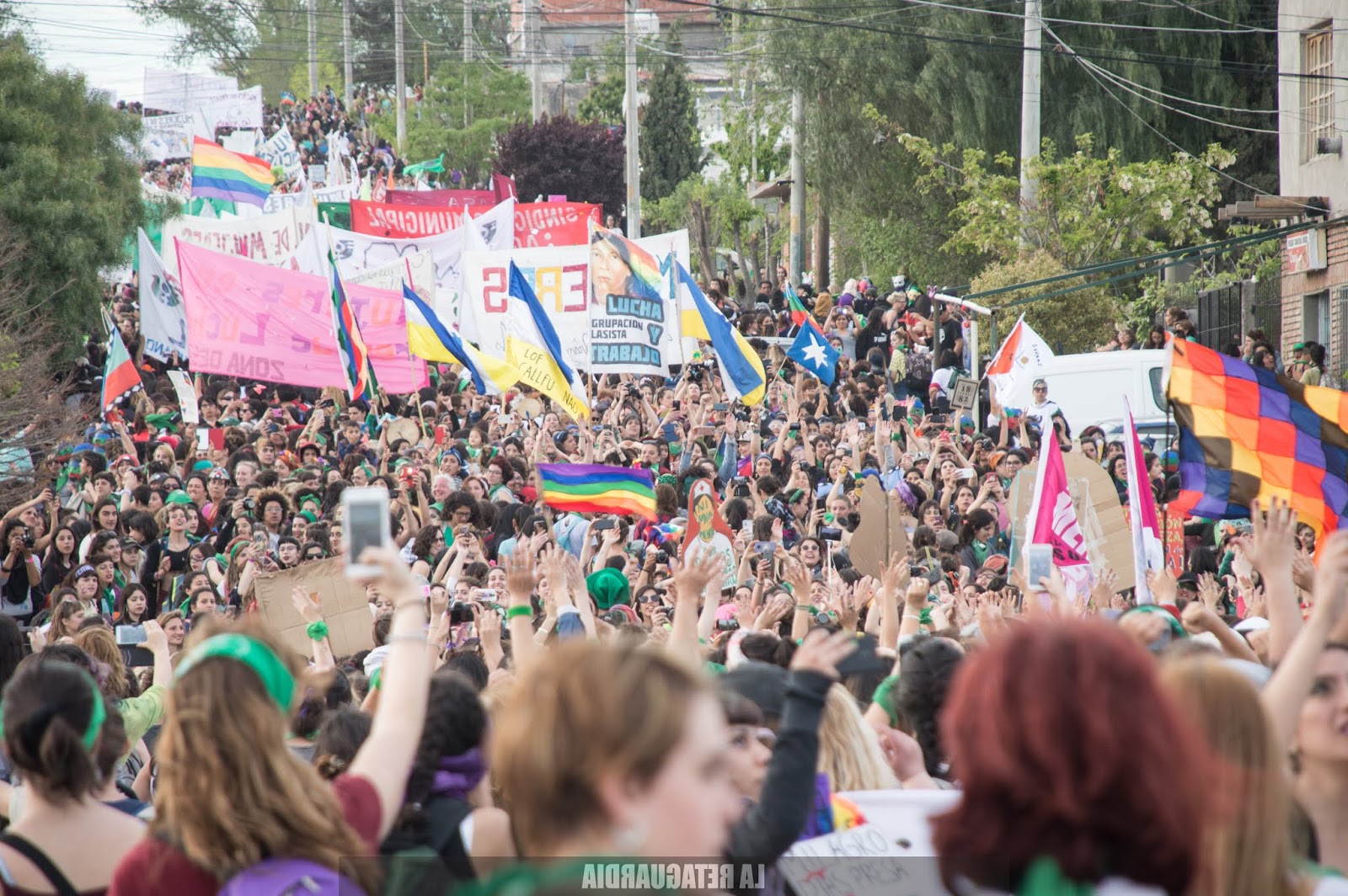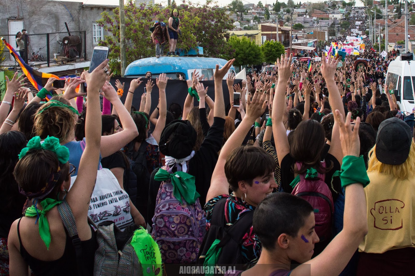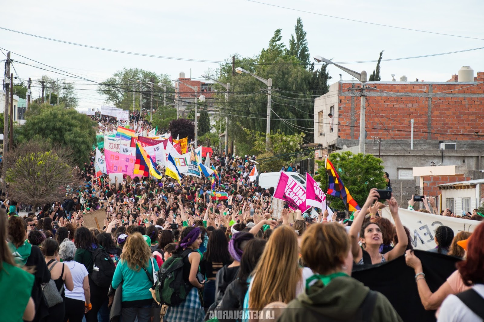 Aún no sabíamos el recorrido pero encaramos adonde iban todas. La marcha tuvo una extensión de 40 cuadras. Las vecinas de 2, 3, 4 años mirándonos marchar. Escuchándonos cantar. Miraban con sonrisa gigante, con ojos abiertos así de grandes. Aplaudiendo mientras pasábamos agitando el pañuelo. Mirando de lejos, en patas, sobre el techo de sus casas, niñas, niños, señores, señoras, pibitos. Doñas de 50, 60, 70 años siendo felices con nosotras. Diciéndonos «Esto es histórico. Estoy muy contenta, ustedes son muy buenas, muy respetuosas. En mi vida imaginé ver algo así, todas me saludan, todas contentas. Las quiero». Familias enteras mirando desde el techo, o por la ventana, corriendo la cortina tímidamente. Niñas agitando los brazos, saltando, festejando detrás de las rejas. La señora y el perrito mirando sobre la vereda hacia el tumulto de pibas, tortas, negras, sudacas, originarias, travas, no binaries, trans que se acercaba colorido, brillante, diverso, inmenso, casi infinito. Todas ellas: las niñas de 2, 3, 4 años y las doñas de 50, 60, 70 años. Todas reconociéndonos en los feminismos. Empoderándonos.