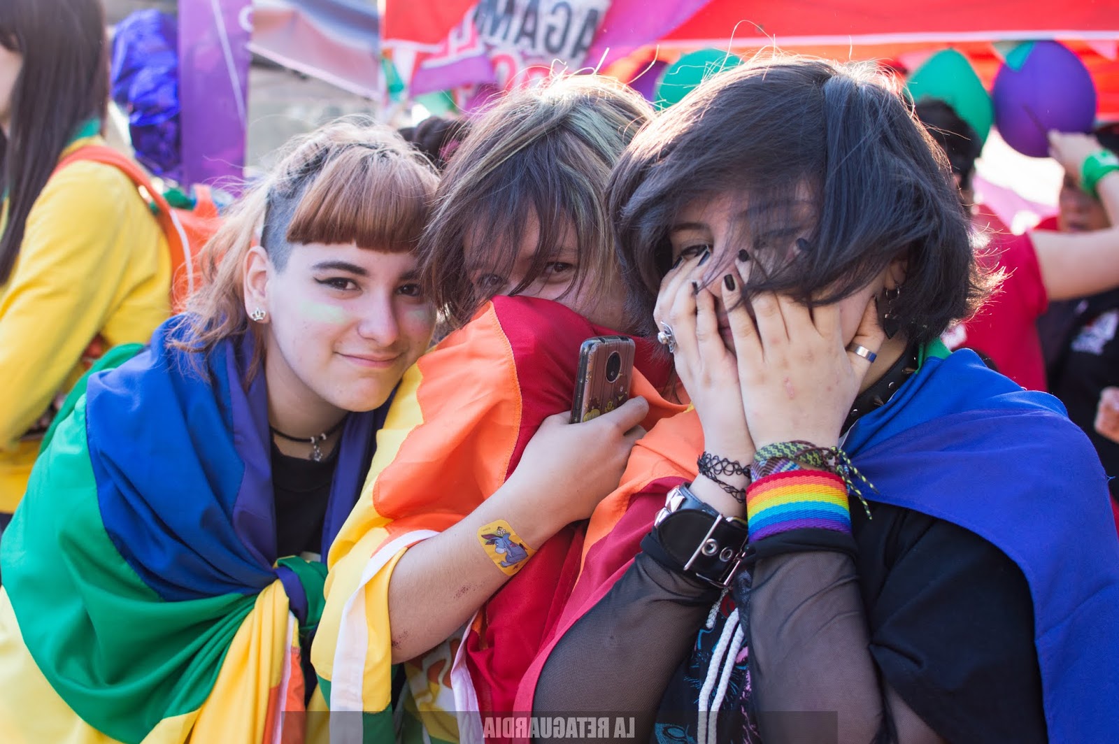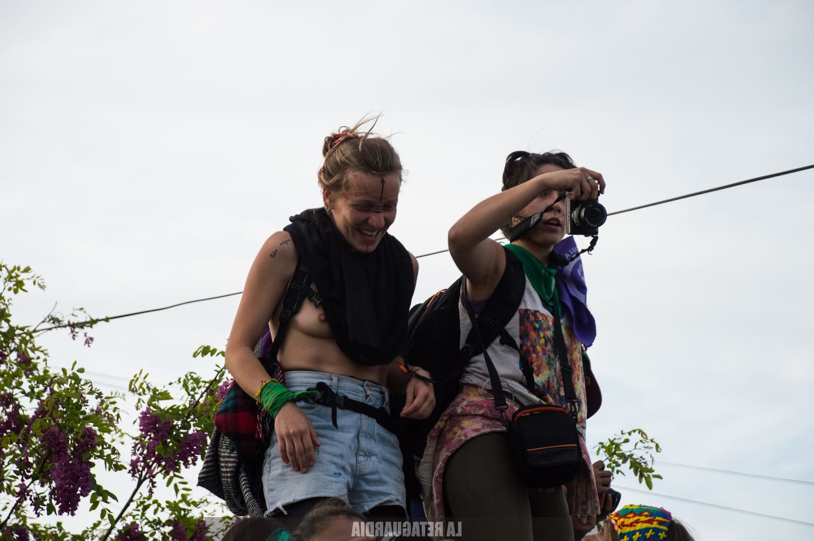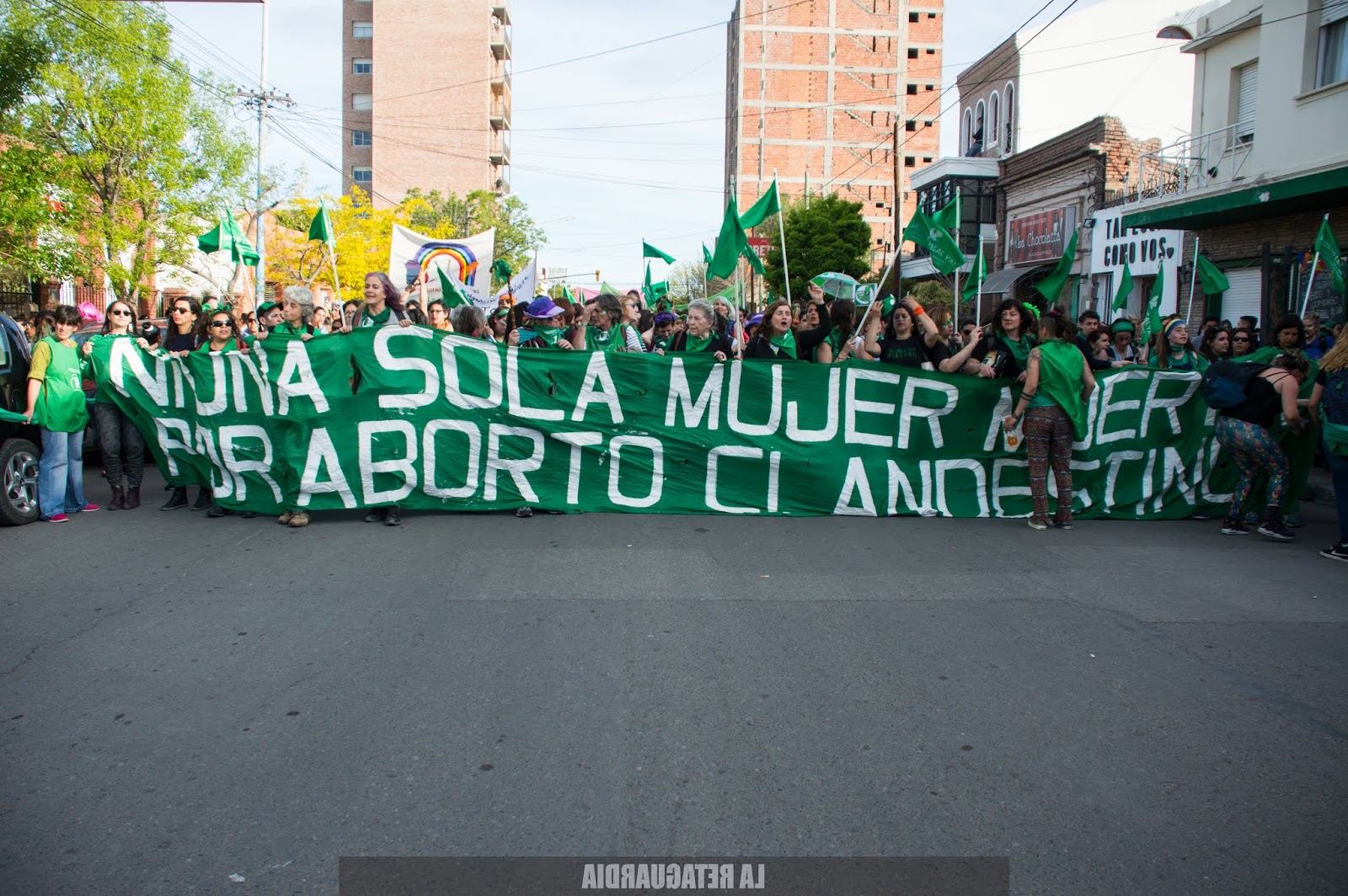 Aún no sabíamos el recorrido pero encaramos adonde iban todas. La marcha tuvo una extensión de 40 cuadras. Las vecinas de 2, 3, 4 años mirándonos marchar. Escuchándonos cantar. Miraban con sonrisa gigante, con ojos abiertos así de grandes. Aplaudiendo mientras pasábamos agitando el pañuelo. Mirando de lejos, en patas, sobre el techo de sus casas, niñas, niños, señores, señoras, pibitos. Doñas de 50, 60, 70 años siendo felices con nosotras. Diciéndonos «Esto es histórico. Estoy muy contenta, ustedes son muy buenas, muy respetuosas. En mi vida imaginé ver algo así, todas me saludan, todas contentas. Las quiero». Familias enteras mirando desde el techo, o por la ventana, corriendo la cortina tímidamente. Niñas agitando los brazos, saltando, festejando detrás de las rejas. La señora y el perrito mirando sobre la vereda hacia el tumulto de pibas, tortas, negras, sudacas, originarias, travas, no binaries, trans que se acercaba colorido, brillante, diverso, inmenso, casi infinito. Todas ellas: las niñas de 2, 3, 4 años y las doñas de 50, 60, 70 años. Todas reconociéndonos en los feminismos. Empoderándonos.