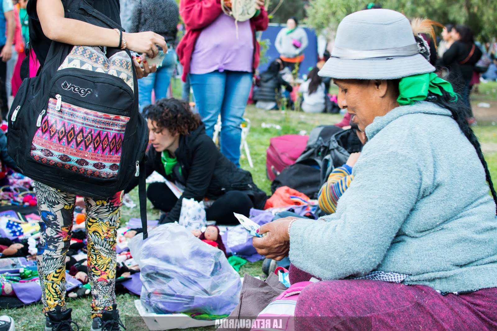 Estuvimos en la feria feminista, otro de los brazos empoderantes. La economía autogestiva feminista se nutre en los encuentros. Con libros, fanzines, ropa, artesanías que son sostén de muchos grupos de mujeres y disidencias. Trocamos, nos recomendamos, nos apoyamos. La feria es momento de conocernos, de admirar la creatividad y la diversidad de las feriantes. En la plaza Centenario se armaron los puestos con perchero, mesita o paño. En el parlante sonaban artistas feministas como Sara Hebe, la Negra Liyah, Bomba Estereo. También escuchamos a las trabajadoras despedidas de Télam, a Soraya Maicoño pidiendo la libertad del Lonko Facundo Jones Huala, a los feminismos del Abya Yala demostrando que Latinoamérica es toda feminista, levantando el reclamo por la visibilidad y el reconocimiento de las existencias originarias. La Comisión Organizadora fue denunciada por racista, al negarse al cambio del nombre del Encuentro por la propuesta de las Mujeres Originarias por el Buen Vivir: dejar de borrar la historia y nombrar la Plurinacionalidad. Además de incluir este pedido, también se reclama la necesidad de visibilizar las diversas identidades de género. Y aunque burocraticen e intenten silenciarlas muchas de nosotras ya empezamos a llamar al encuentro así: Encuentro Plurinacional de Mujeres, Lesbianas, Travestis y Trans.