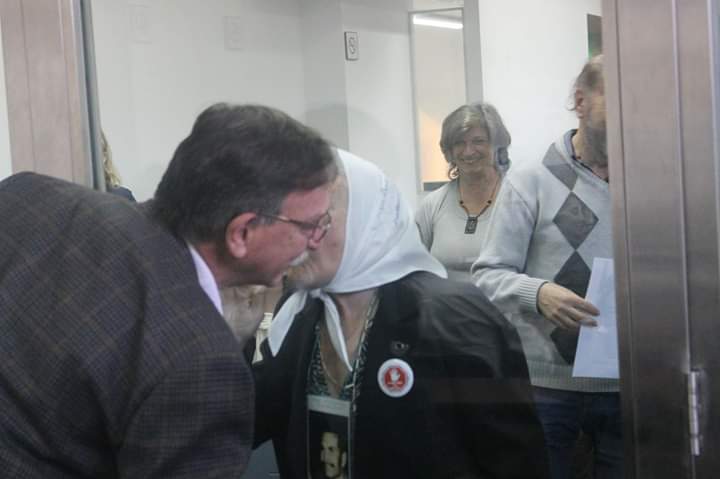 | Nora Cortiñas besa a Carlos Lorddkipanidse a través del vidrio que divide al público de las partes. (Foto: Jorgelina Méndez) |