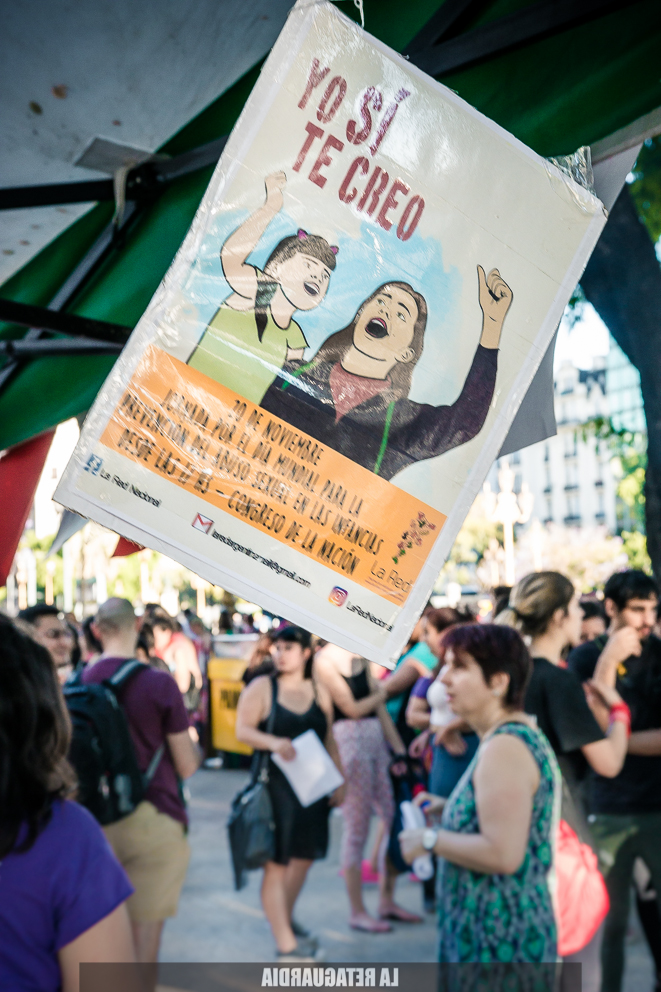 «Yo sí te creo». levantando este principio fundamental en el acompañamiento a sobrevivientes de abusos en las infancias, se realizaron actividades de visibilización en la Plaza Congreso. Con juegos para peques, bandas, volanteadas y performance «artivista», cientos de personas se concentraron sobre la calle Rivadavia para, además de incentivar el acompañamiento a sobrevivientes y brindar apoyo emocional, dar a conocer la campaña que pide que los delitos de abuso no prescriban, y que no se revincule a los abusadores con las y los sobrevivientes. (Fotoinforme de Natalia Bernades para La Retaguardia)