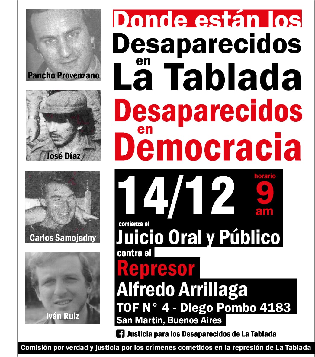 *Este diario del juicio por los desaparecidos de La Tablada es una herramienta de difusión llevada adelante por integrantes de La Retaguardia, FM La Caterva y Agencia Paco Urondo, con la finalidad de difundir esta instancia de justicia que tanto ha costado conseguir. Agradecemos todo tipo de difusión y reenvío, de modo totalmente libre, citando la fuente. Seguimos diariamente en http://desaparecidosdelatablada.blogspot.com