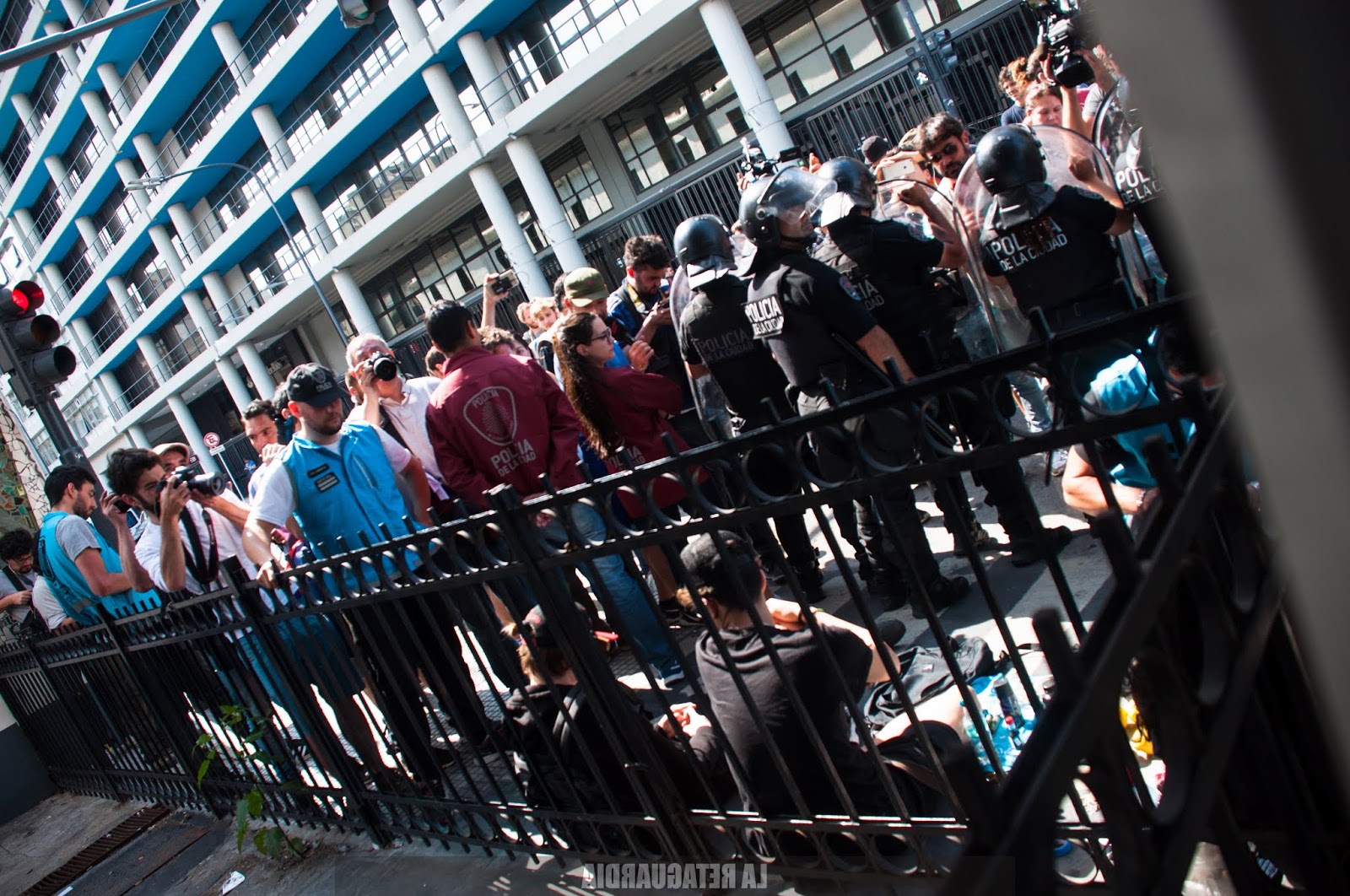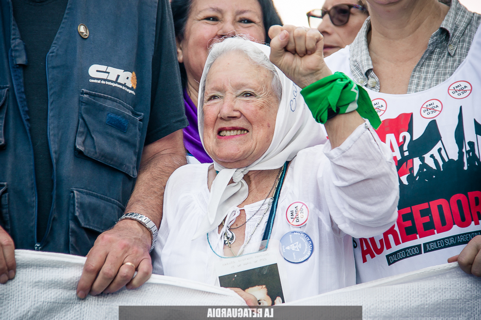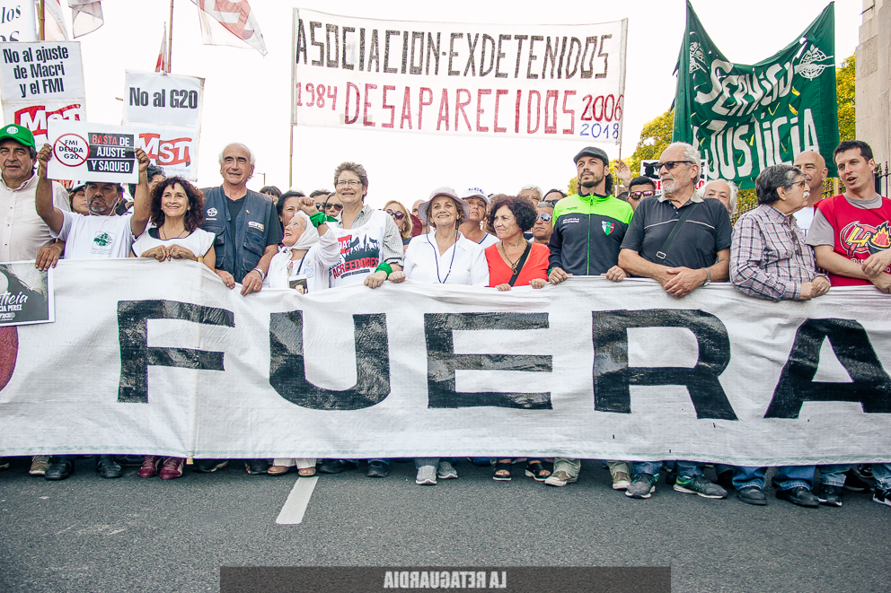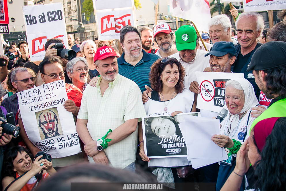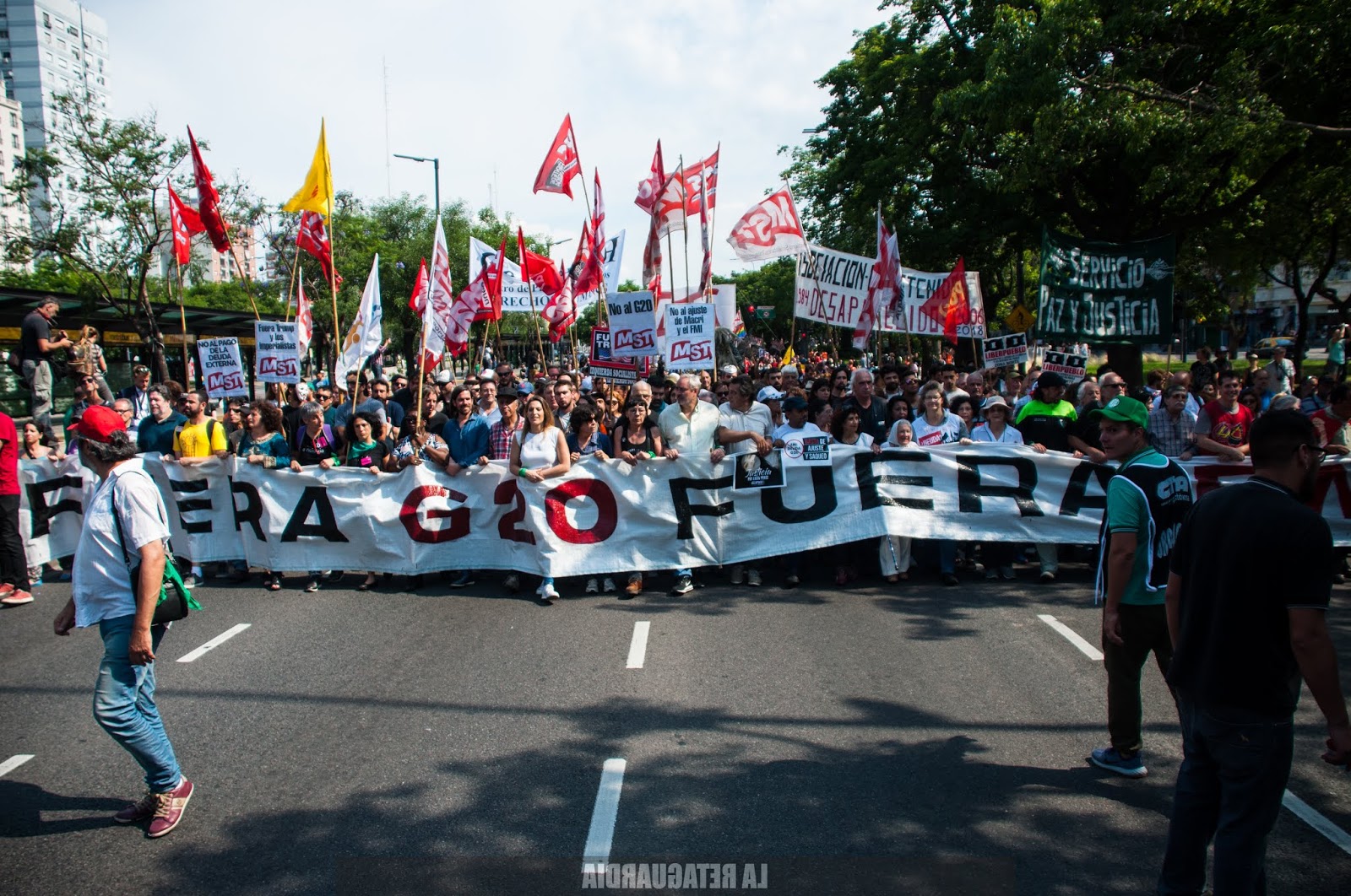 Una multitudinaria marcha se realizó esta tarde por el centro porteño para repudiar al G20 y al FMI. La encabezó Nora Cortiñas, quien leyó el documento del Encuentro Memoria, Verdad y Justicia (EMVyJ). Los hechos de hostigamiento más graves por parte de la policía se registraron contra el FIT. Antes del comienzo de la marcha fue detenido Guillo Pitonesi, el apoderado nacional del PTS y los camiones de ese partido y del PO fueron requisados al desconcentrar. Además de detener a varias personas que se manifestaron, entre ellos, 3 menores de edad. Todos recuperaron la libertad después de la medianoche.